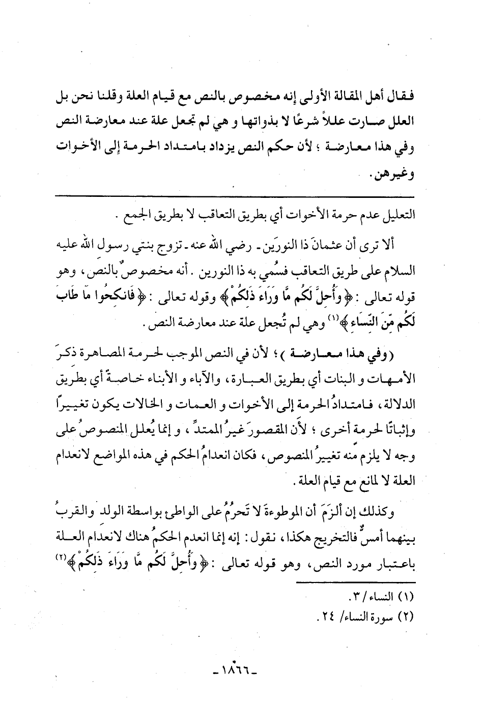 ألا ترى أن عثمان ذا النورين- رضي الله عنه- تزوج بنتي رسول الله عليه السلام على طريق التعاقب فسمي به ذا النورين، أنه مخصوص بالنص، وهو قوله تعالى: (وأُحِلَّ لَكُم مَّا ورَاءَ ذَلِكُمْ) وقولة تعالى: (فَانكِحُوا مَا طَابَ لَكُم مِّنَ النِّسَاءِ) وهي لم تجعل علة عند معارضة النص.