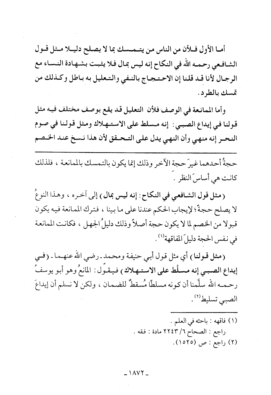 (مثل قول الشافعي في النكاح: إنه ليس بمال) إلى آخره، وهذا النوع لا يصلح حجة، لإيجاب الحكم عندنا على ما بينا، فترك الممانعة فيه يكون قبولًا من الخصم لما لا يكون حجة أصلًا وذلك دليل الجهل، فكانت الممانعة في نفس الحجة دليل المفاقهة.