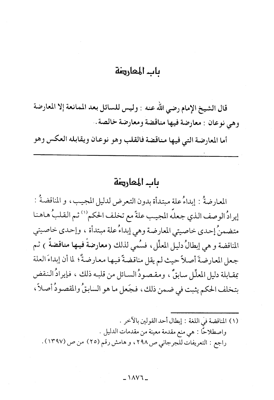 المعارضة: إبداء علة مبتدأة بدون التعرض لدليل المجيب، والمناقضة: إيراد الوصف الذي جعله المجيب علة مع تخلف الحكم ثم القلب ها هنا متضمن إحدى خاصيتي المعارضة وهي إبداء علة مبتدأة، وإحدى خاصيتي المناقضة وهي إبطال دليل المعلل، فسمي لذلك (معارضة فيها مناقضة) ثم جعل المعارضة أصلًا حيث لم يقل فيها معارضة؛ لما أن إبداء العلة بمقابلة دليل المعلل سابق، ومقصود السائل من قلبه ذلك، فإيراد النقض بتخلف الحكم يثبت في ضمن ذلك، فجعل ما هو السابق والمقصود أصلًا،