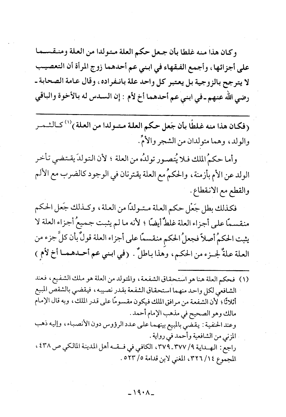 فكذلك بطل جعل حكم العلة متولدًا من العلة ,وكذلك جعل الحكم منقسمًا على أجزاء العلة غلط أيضا, لأنه لم يثبت جميع أجزاء العلة لا يثبت الحكم أصلًا فجعل الحكم منقسمًا على أجزاء العلة قول بأن كل جزء من العلة علة لجزء من الحكم, وهذا باطل. (في ابني عم أحدهما أخ لأم)
