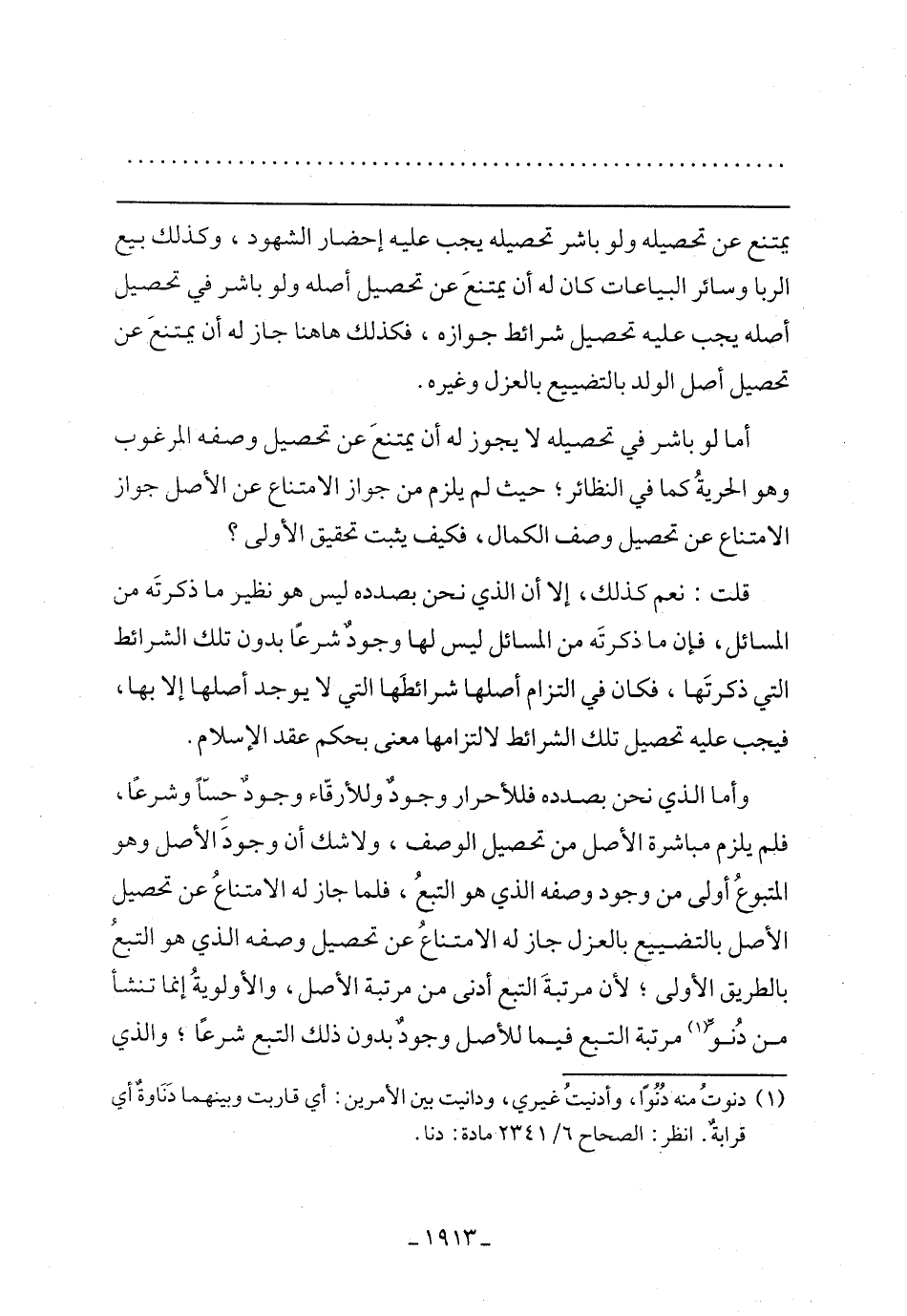 وأما الذي نحن بصدده فللأحرار وجود وللأرقاء وجود حسًا وشرعًا, فلم يلزم مباشرة الأصل من تحصيل الوصف, ولا شك أن وجود الأصل وهو المتبوع أولى من وجود وصفه الذي هو التبع, فلما جاز له الامتناع عن تحصيل الأصل بالتضييع بالعزل جاز له الإمتناع عن تحصيل وصفه الذي هو التبع بالطريق الأولى: لأن مرتبة التبع أدنى من مرتبة الأصل, والأولوية إنما تنشأ من دنو مرتبة التبع فينا للأصل وجود بدون ذلك التبع شرعًا, والذي