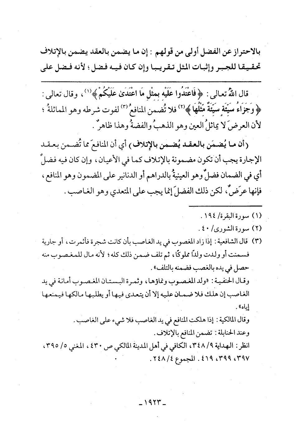 قال الله تعالى: (قِصَاصٌ فَمَنِ اعْتَدَى عَلَيْكُمْ فَاعْتَدُوا عَلَيْهِ بِمِثْلِ مَا اعْتَدَى عَلَيْكُمْ وَاتَّقُوا اللَّهَ وَاعْلَمُوا أَنَّ اللَّهَ مَعَ الْمُتَّقِينَ (194) , وقال تعالى: (وَجَزَاءُ سَيِّئَةٍ سَيِّئَةٌ مِثْلُهَا فَمَنْ عَفَا وَأَصْلَحَ فَأَجْرُهُ عَلَى اللَّهِ إِنَّهُ لَا يُحِبُّ الظَّالِمِينَ (40)) فلا تضمن المنافع لفوت شرطه وهو المماثلة: لأن العرض لا يماثل العين وهو الذهب والفضة وهذا ظاهر.