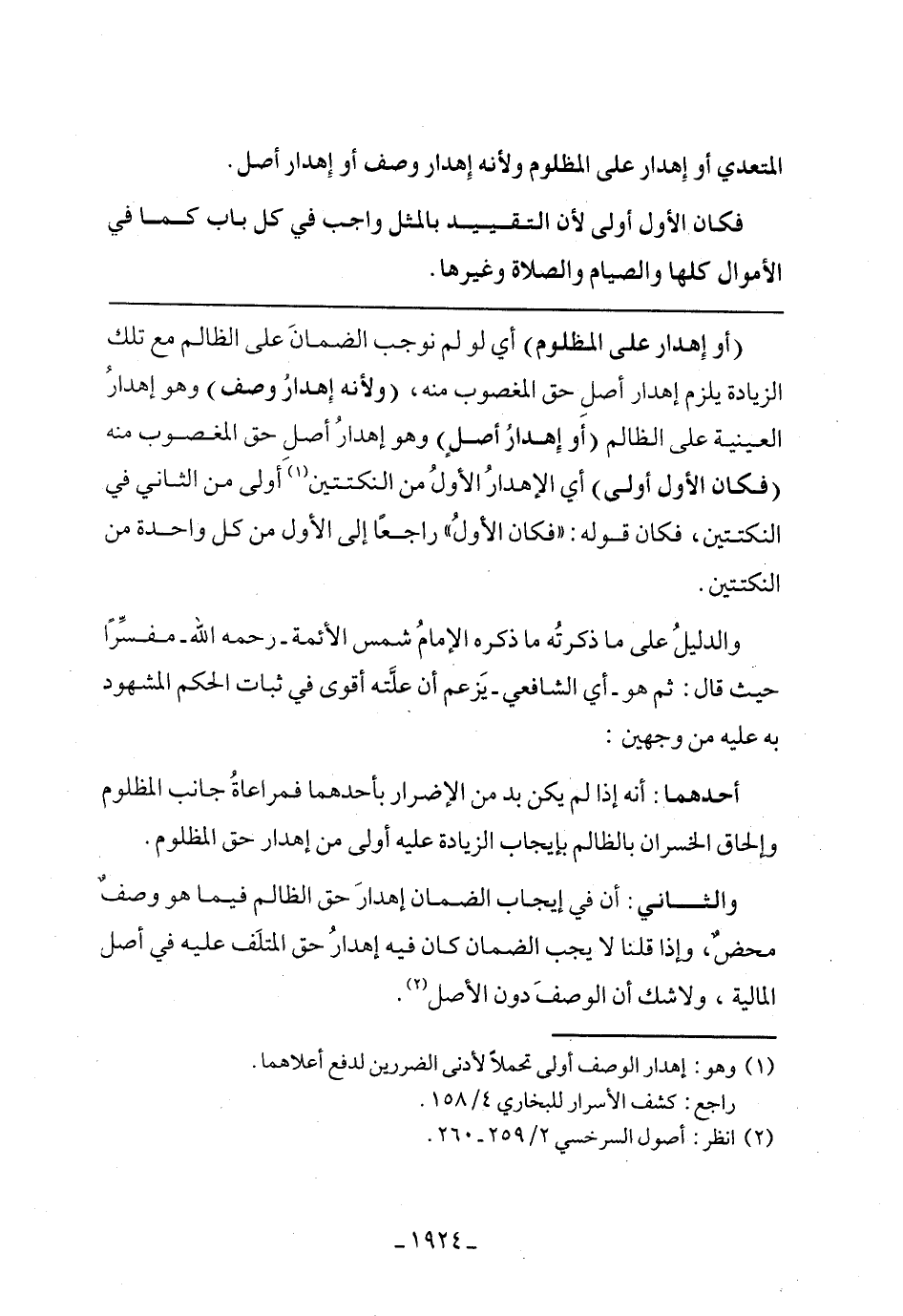 والثاني: أن في إيجاب الضمان إهدار حق الظالم فيما هو وصف محض, وإذا قلنا لا يجب الضمان كان فيه إهدار حق المتلف عليه في أصل المالية, ولا شك أن الوصف دون الأصل.