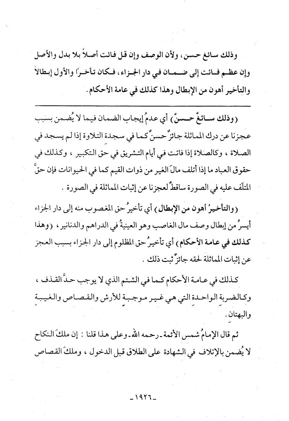 ثم قال الإمام شمس الأئمة- رحمه الله- وعلى هذا قلنا: إن ملك النكاح لا يضمن بالإتلاف في الشهادة على الطلاق قبل الدخول، وملك القصاص