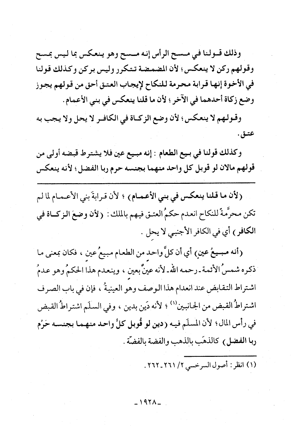 (أنه مبيع عين) أي أن كل واحد من الطعام مبيع عين، فكان بمعنى ما ذكره شمس الأئمة -رحمه الله- لأنه عين بعين، وينعدم هذا الحكم وهو عدم اشتراط التقابض عند انعدام هذا الوصف وهو العينية، فإن في باب الصرف اشتراط القبض من الجانبين؛ لأنه دين بدين، وفي السلم اشتراط القبض في رأس المال؛ لأن المسلم فيه (دين لو قوبل كل واحد منهما بجنسه حرم ربا الفضل) كالذهب بالذهب والفضة بالفضة.