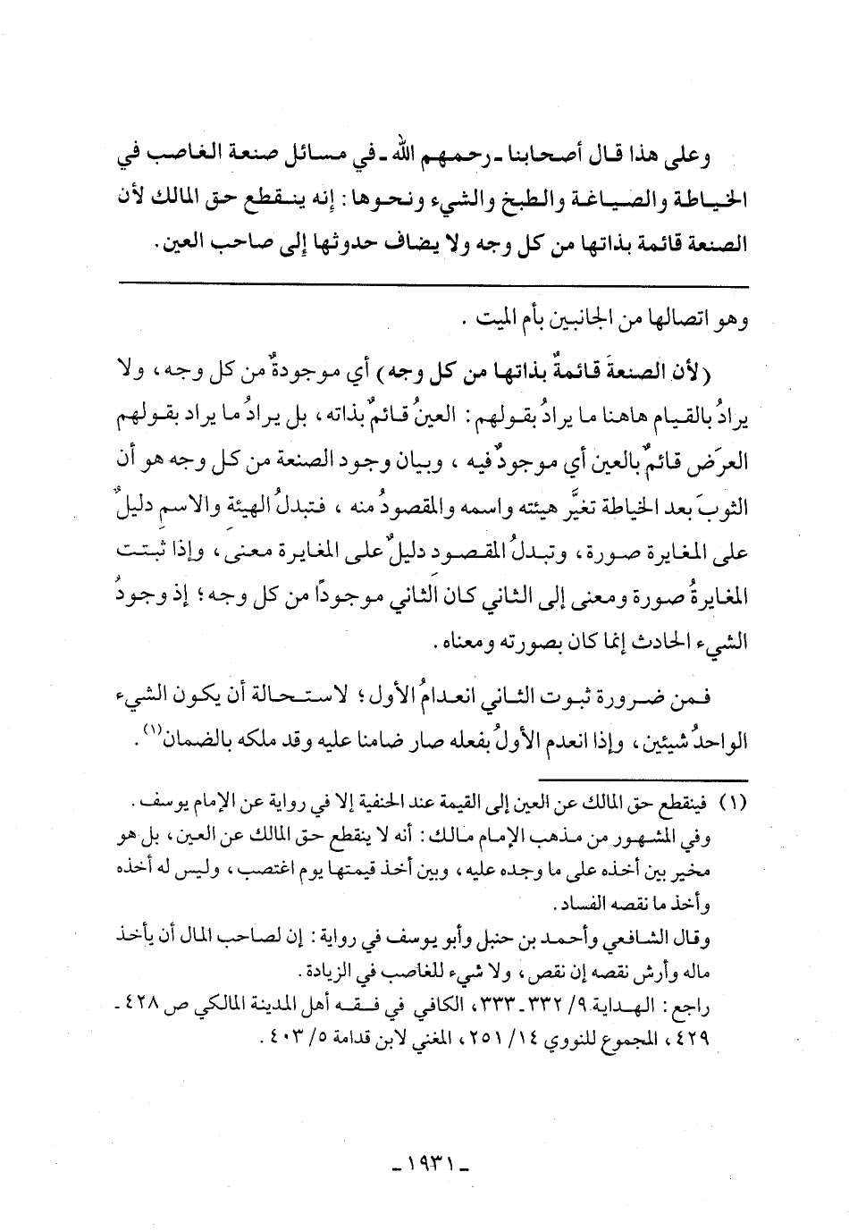 (لأن الصنعة قائمة بذاتها من كل وجه) أي موجودة من كل وجه، ولا يراد بالقيام هاهنا ما يراد بقولهم: العين قائم بذاته، بل يراد ما يراد بقولهم العرض قائم بالعين أي موجود فيه، وبيان وجود الصنعة من كل وجه هو أن الثوب بعد الخياطة تغير هيئته واسمه المقصود منه، فتبدل الهيئة والاسم دليل على المغايرة صورة، وتبدل المقصود دليل على المغايرة معنى، وإذا ثبتت المغايرة صورة ومعنى إلى الثاني كان الثاني موجودا من كل وجه؛ إذ وجود الشيء الحادث إنما كان بصورته ومعناه.