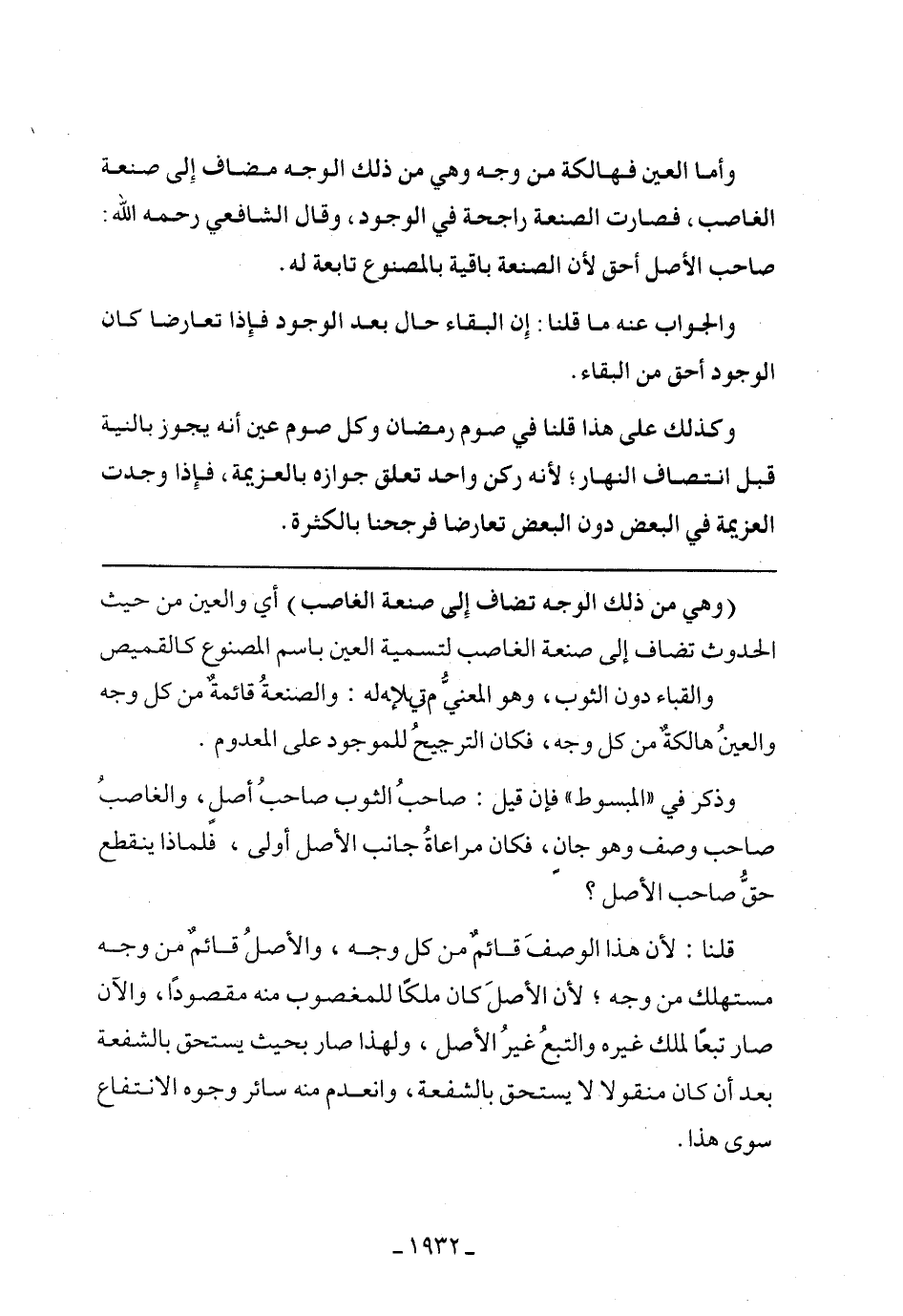 قلنا: لأن هذا الوصف قائم من كل وجه، والأصل قائم من وجه مستهلك من وجه؛ لأن الأصل كان ملكا للمغصوب منه مقصودا، والآن صار تبعا لملك غيره والتبع غير الأصل، ولهذا صار بحيث يستحق بالشفعة بعد أن كان منقولا لا يستحق بالشفعة، وانعدم منه سائر وجوه الانتفاع سوى هذا.