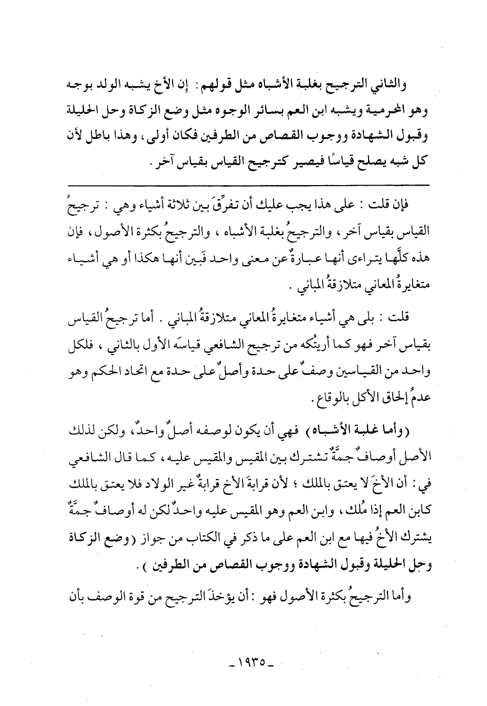 (وأما غلبة الأشباه) فهي أن يكون لوصفه أصل واحد، ولكن لذلك الأصل أوصاف جمة تشترك بين المقيس والمقيس عليه، كما قال الشافعي في: أن الأخ لا يعتق بالملك؛ لأن قرابة الأخ قرابة غير الولاد فلا يعتق بالملك كابن العم إذا ملك، وابن العم وهو المقيس عليه واحد لكن له أوصاف جمة يشترك الأخ فيها مع ابن العم على ما ذكر في الكتاب من جواز (وضع الزكاة وحل الحليلة وقبول الشهادة ووجوب القصاص من الطرفين).