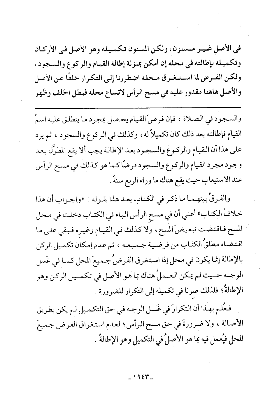 والسجود في الصلاة، فإن فرض القيام يحصل بمجرد ما ينطلق عليه اسم القيام فإطالته بعد ذلك كان تكميلا له، وكذلك في الركوع والسجود، ثم يرد على هذا أن القيام والركوع والسجود بعد الإطالة يجب ألا يقع المطول بعد وجود مجرد القيام والركوع والسجود فرضا كما هو كذلك في مسح الرأس عند الاستيعاب حيث يقع هناك ما وراء الربع سنة.