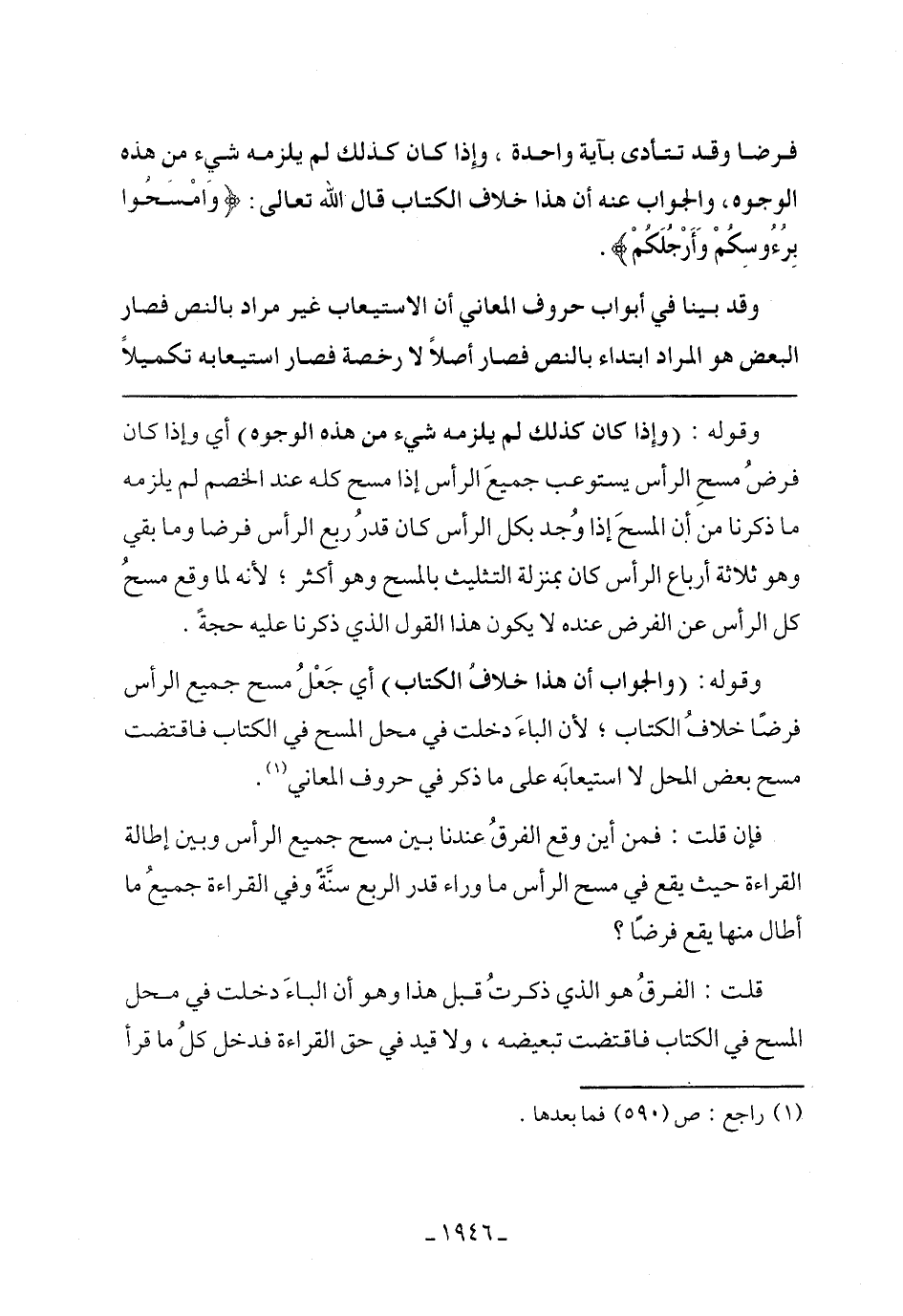وقوله: (وإذا كان كذلك لم يلزمه شيء من هذه الوجوه) أي وإذا كان فرض مسح الرأس يستوعب جميع الرأس إذا مسح كله عند الخصم لم يلزمه ما ذكرنا من أن المسح إذا وجد بكل الرأس كان قدر ربع الرأس فرضا وما بقي وهو ثلاثة أرباع الرأس كان بمنزلة التثليث بالمسح وهو أكثر، لأنه لما وقع مسح كل الرأس عند الفرض عنده لا يكون هذا القول الذي ذكرنا عليه حجة.