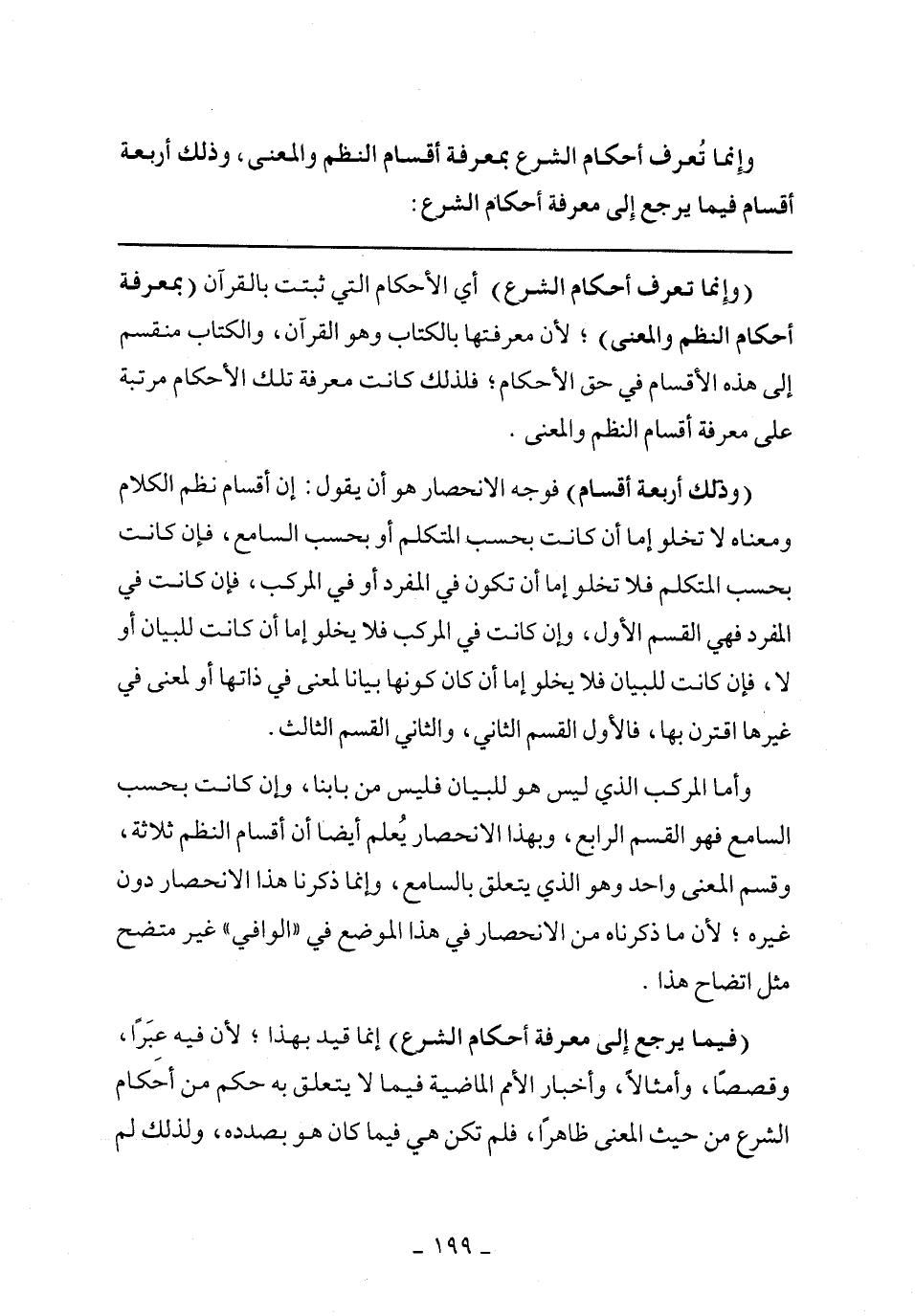 وأما المركب الذي ليس هو للبيان فليس من بابنا، وإن كانت بحسب السامع فهو القسم الرابع، وبهذا الانحصار يعلم أيضًا أن أقسام النظم ثلاثة، وقسم المعنى واحد وهو الذي يتعلق بالسامع، وإنما ذكرنا هذا الانحصار دون غيره؛ لأن ما ذكرناه من الانحصار في هذا الموضع في "الوافي" غير متضح مثل اتضاح هذا.