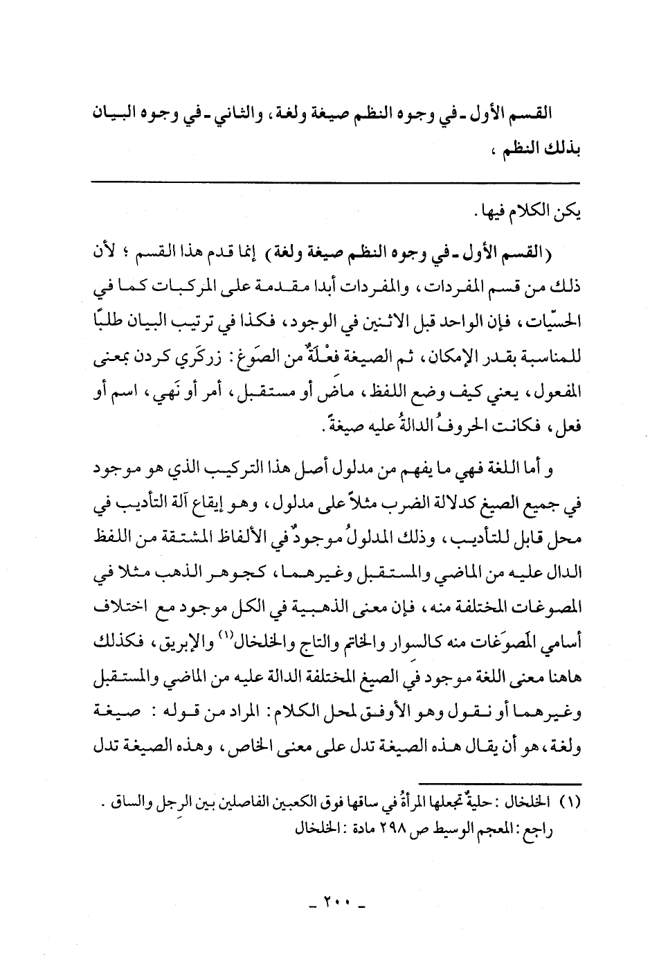 (القسم الأول- في وجوه النظم صيغة ولغة) إنما قدم هذا القسم؛ لأن ذلك من قسم المفردات، والمفردات أبدًا مقدمة على المركبات كمل في الحسيات، فإن الواحد قبل الأتنين في الوجود، فكذا في ترتيب البيان طلبًا للمناسبة بقدر الإمكان، ثم الصيغة فعلة من الصوغ: زكي كدرن بمعني المفعول، يعني كيف وضع اللفظ، ماض أو مستقبل، أو نهي، اسم أو فعل، فكانت الحروف الدالة عليه صيغة.