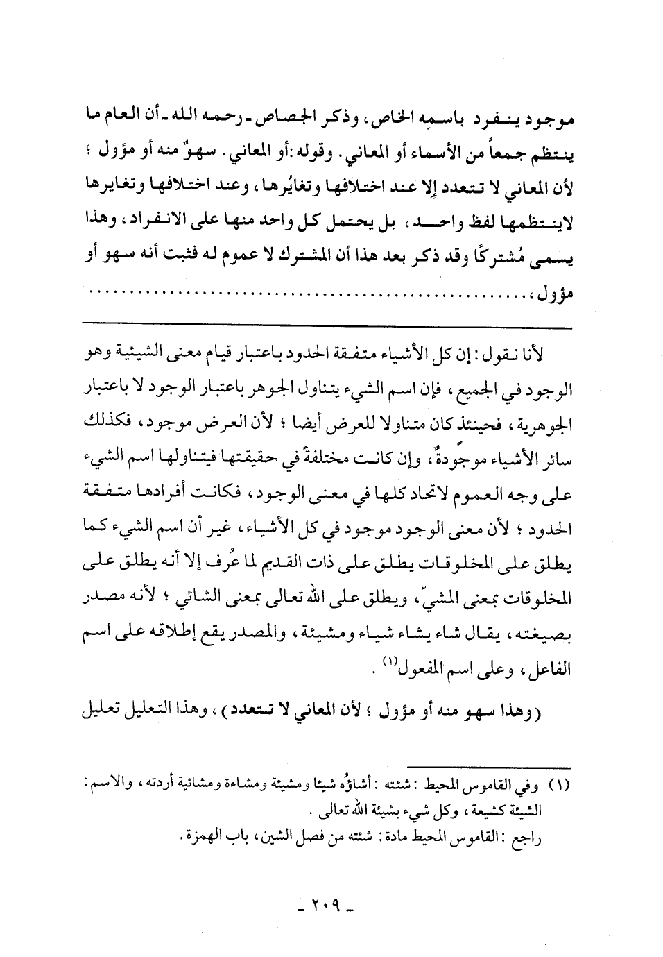 لأنا نقول: إن كل الأشياء متفقة الحدود باعتبار قيام معنى الشيئية وهو الوجود في الجميع، فإن اسم الشيء يتناول الجوهر باعتبار الوجود لا باعتبار الجوهرية، فحينئذ كان متناولًا للعرض أيضًا؛ لأن العرض موجود، فكذلك سائر الأشياء موجودة، وإن كانت مختلفة في حقيقتها فيتناولها اسم الشيء على وجه العموم لاتحاد كلها في معنى الوجود، فكانت أفرادها متفقة الحدود؛ لأن معنى الوجود موجود في كل الأشياء، غير إن اسم الشيء كما يطلق على المخلوقات يطلق على ذات القديم لما عرف إلا أنه يطلق على المخلوقات بمعنى المشي، ويطلق على الله تعالى بمعنى الشائي؛ لأنه مصدر بصيغته، يقال شاء يشاء شياء ومشيئة، والمصدر يقع إطلاقه على اسم الفاعل، وعلى اسم المفعول.