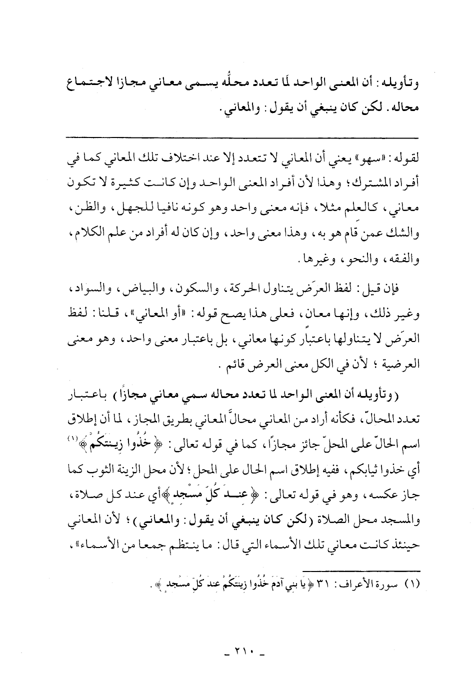 لقوله: "سهو" يعني أن المعاني لا تتعدد إلا عند اختلاف تلك المعاني كما في أفراد المشترك؛ وهذا لأن أفراد المعنى الواحد وإن كانت كثيرة لا تكون معاني، كالعلم مثلًا، فإنه معنى واحد هو كونه نافيًا للجهل، والظن، والشك عمن قام هو به، وهذا معنى واحد، وإن كان له أفراد من علم الكلام، والفقه، والنحو، وغيرها.