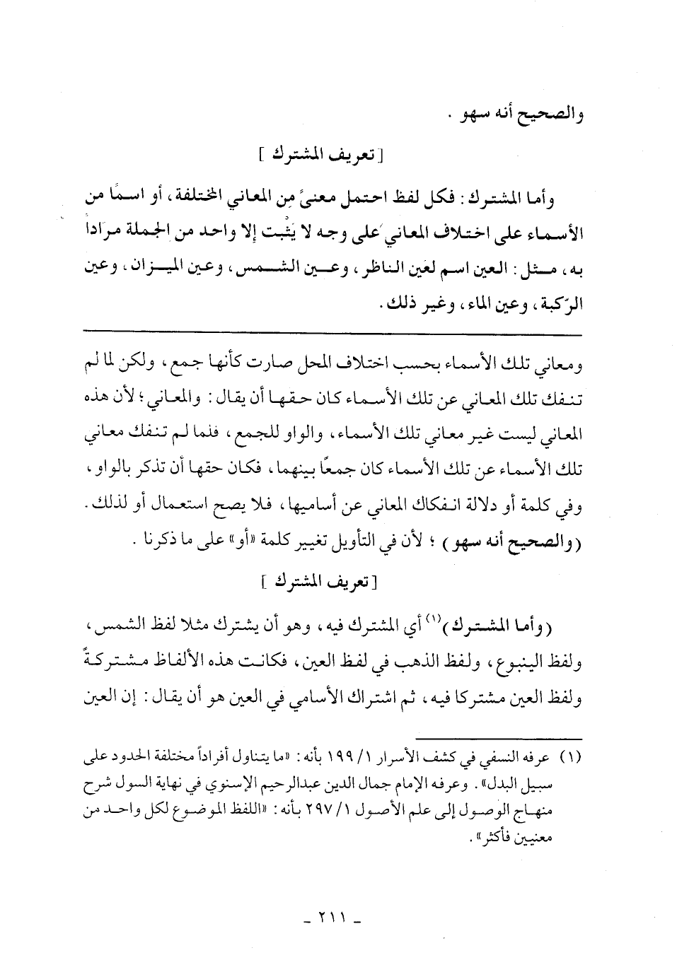 (وأما المشترك) أي المشترك فيه، وهو أن يشترك مثلًا لفظ الشمس، ولفظ الينبوع، ولفظ الذهب في لفظ العين، فكانت هذه الألفاظ مشتركة ولفظ العين مشتركًا فيه، ثم اشتراك الأسامي في العين هو أن يقال: إن العين
