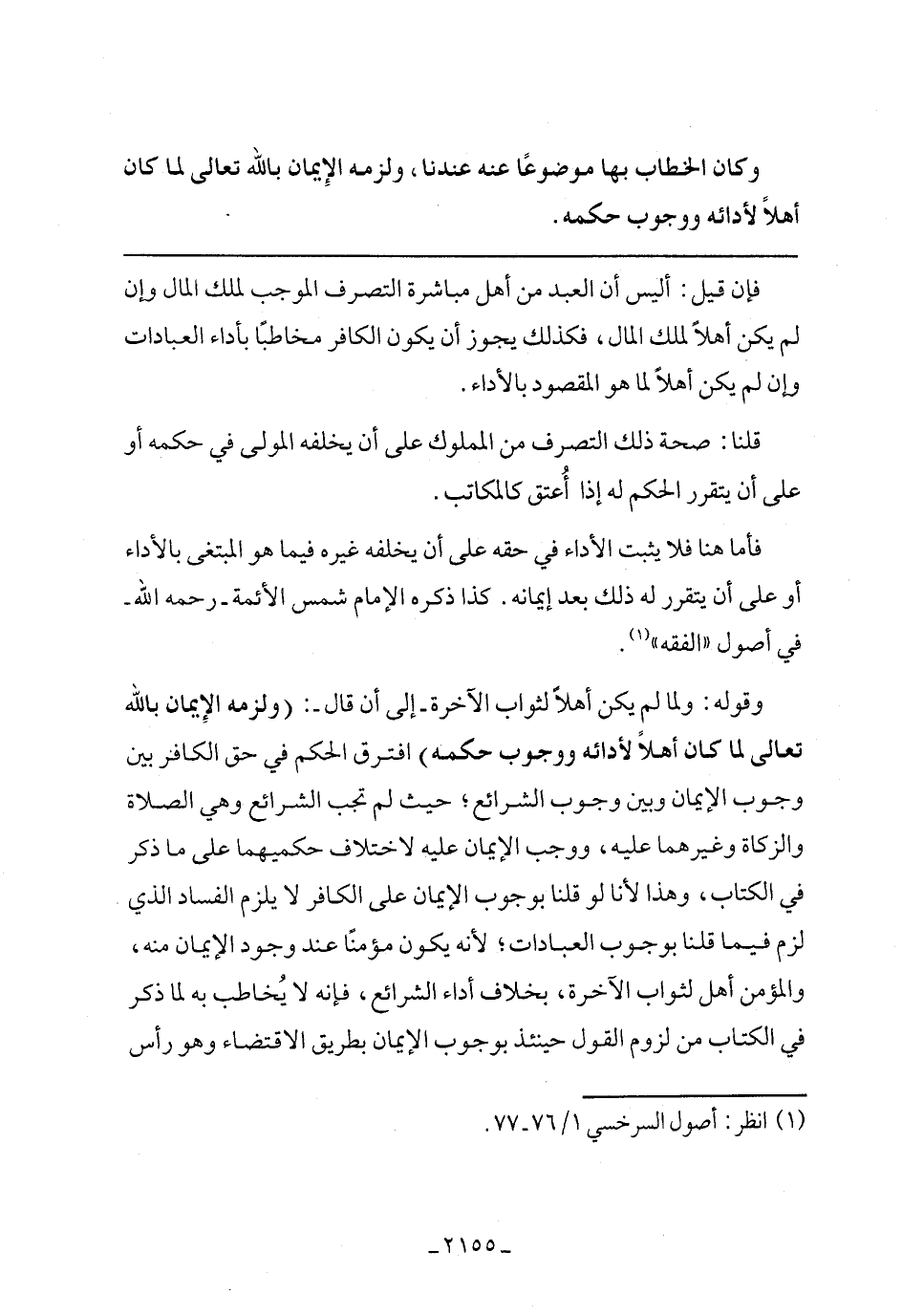 وقوله: ولما يكن أهلًا لثواب الآخرة -إلى أن قال-: (ولزمه الإيمان بالله تعالى لما كان أهلًا لأدائه ووجوب حكمه) افترق الحكم في حق الكافر بين وجوب الإيمان وبين وجوب الشرائع حيث لم تجب الشرائع وهي الصلاة والزكاة وغيرهما عليه ووجب الإيمان عليه لإختلاف حكميهما على ما ذكر في الكتاب وهذا لأنا لو قلنا بوجوب الإيمان على الكافر لا يلزم الفساد الذي لزم فيما قلنا بوجوب العبادات لأنه يكون مؤمنًا عند وجود الإيمان منه والمؤمن أهل لثواب الآخرة بخلاف أداء الشرائع فإنه لا يخاطب به لما ذكر في الكتاب من لزوم القول حينئذ بوجوب الإيمان بطريق الاقتضاء وهو رأس