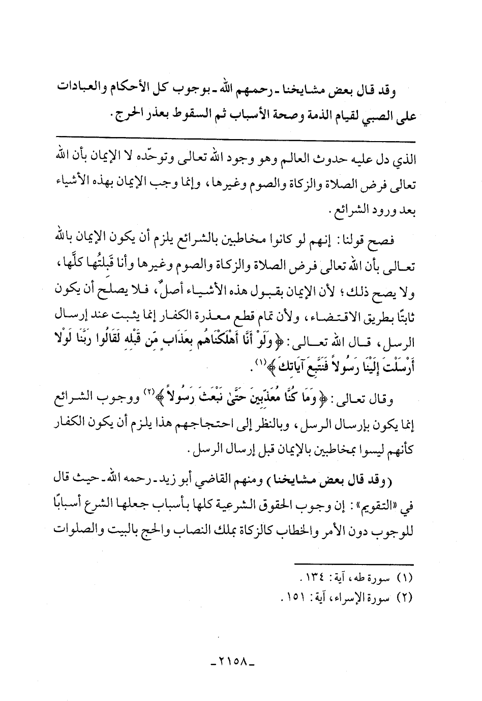 فصح قولنا: إنهم لو كانوا مخاطبين بالشرائع يلزم أن يكون الإيمان بالله تعالى فرض الصلاة والزكاة والصوم وغيرها وأنا قبلتها كلها ولا يصح ذلك لأن الإيمان بقبول هذه الأشياء أصل فلا يصلح أن يكون ثابتًا قال الله تعالى: (وَلَوْ أَنَّا أَهْلَكْنَاهُمْ بِعَذَابٍ مِنْ قَبْلِهِ لَقَالُوا رَبَّنَا لَوْلا أَرْسَلْتَ إِلَيْنَا رَسُولًا فَنَتَّبِعَ آيَاتِكَ)