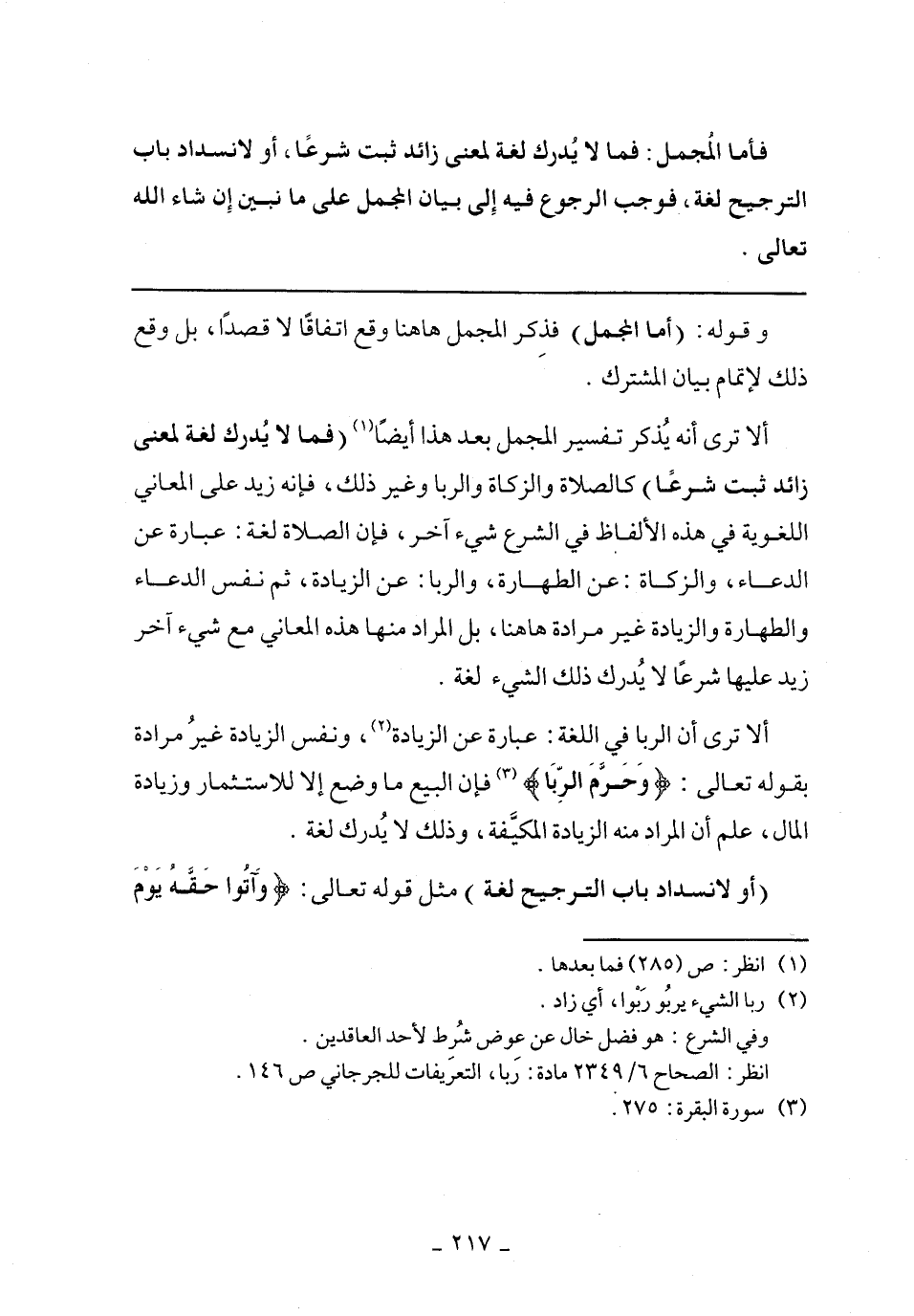 ألا ترى أن الربا في اللغة: عبارة عن الزيادة، ونفس الزيادة غير مراده بقوله تعالى: {وَحَرَّمَ الرِّبَا} فإن البيع ما وضع إلا للاستثمار وزيادة المال، علم أن المراد منه الزيادة المكيفة، وذلك لا يدرك لغة.