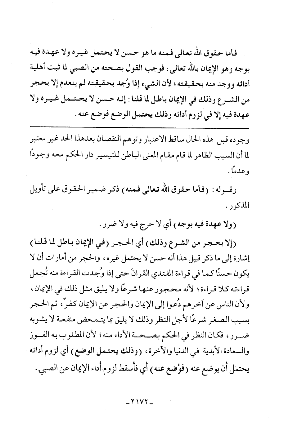 (إلا بحجر من الشرع وذلك) أي الحجر (في الإيمان باطل لما قلنا) إشارة إلى ما ذكر قبيل هذا حسن لا يحتمل غيره والحجر من أمارات أن لا يكون حسناَ كما في قراءة المقتدى القرآن حتى إذا وجدت القراءة منه تجعل قراءته كلا قراءة لأنه محجور عنها شرعًا ولا يليق مثل ذلك في الإيمان ولأن الناس عن آخرهم دعوا إلى الإيمان والحجر عن الإيمان كفر ثم الحجر بسبب الصغر شرعًا لأجل النظر وذلك لا يليق بما يتمحض منفعة لا يشوبه ضرر فكان النظر في الحكم بصحة الأداء منه لأن المطلوب به الفوز والسعادة الأبدية في الدنيا والآخرة (وذلك يحتمل الوضع) أي لزوم أدائه يحتمل أن يوضع عنه (فوضع عنه) أي فأسقط لزوم أداء الإيمان عن الصبي.