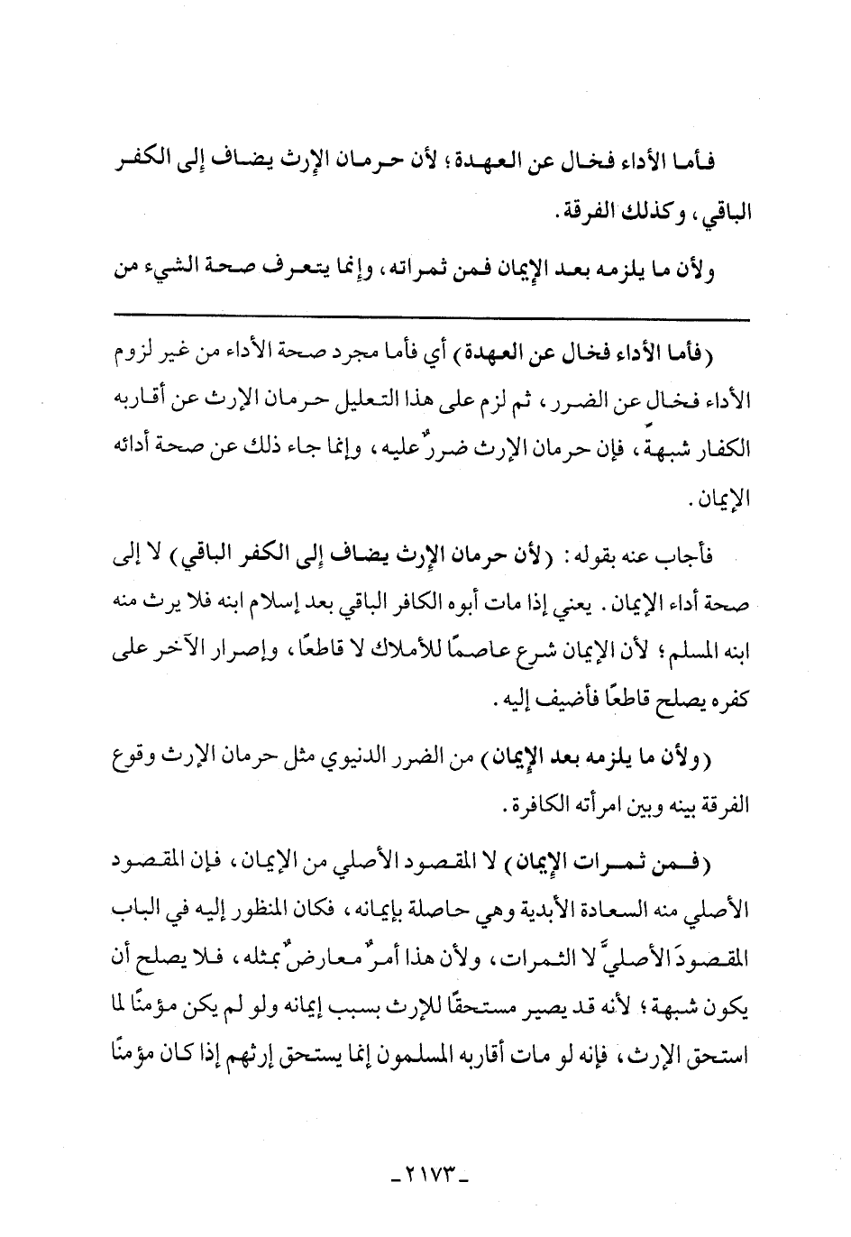 (فمن ثمرات الإيمان) لا المقصود الأصلي من الإيمان فإن المقصود الأصلي منه السعادة الأبدية وهي حاصلة بإيمانه فكان المنظور إليه في الباب المقصود الأصلي لا الثمرات ولأن هذا أمر معارض بمثله فلا يصلح أن يكون شبهة لأنه قد يصير مستحقًا للإرث بسبب إيمانه ولو لم يكن مؤمنًا لما إستحق الإرث، فإنه لو مات أقاربه المسلمون إنما يستحق إرثهم إذا كان مؤمنًا