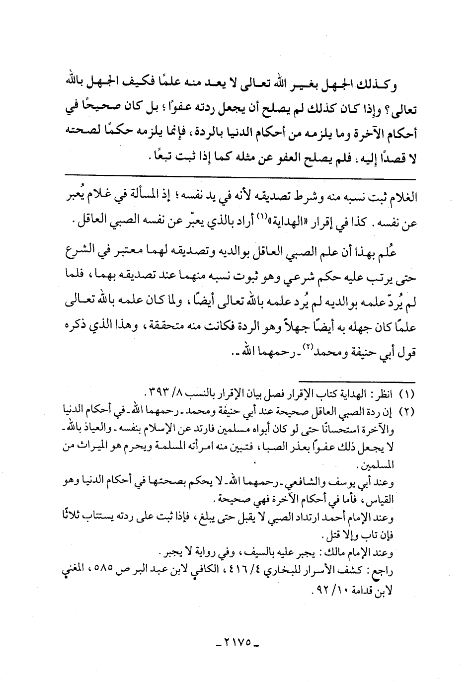 علم بهذا أن علم الصبي العاقل بوالدية وتصديقه لهما معتبر في الشرع حتى يرتب عليه حكم شرعي وهو ثبوت نسبه منهما عند تصديقه بهما فلما لم يرد علمه بوالديه لم يرد علمه بالله تعالى أيضًا ولما كان علمه بالله تعالى علمًا كان جهله به أيضًا جهلًا وهو الردة فكانت منه متحققة وهذا الذي ذكره قول أبي حنيفة ومحمد -رحمهما الله-.