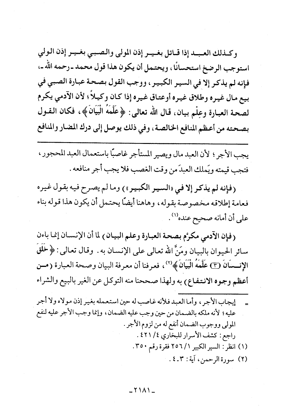 (فإن الآدمي مكرم بصحة العبارة وعلم البيان) لما أن الإنسان إنما باءن سائر الحيوان بالبيان ومن الله تعالى على الإنسان به. وقال تعالى: (خَلَقَ الإِنسَانَ (3) عَلَّمَهُ الْبَيَانَ) , فعرفنا أن معرفة البيان وصحة العبارة (من أعظم وجوه الانتفاع) به ولهذا صححنا منه التوكل عن الغير بالبيع والشراء