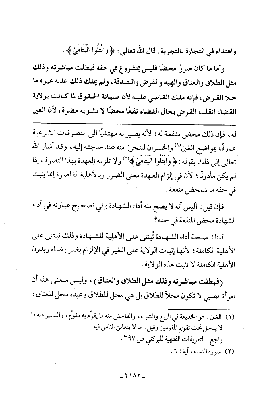 له, فإن ذلك محض منفعة له؛ لأنه يصير به مهتديًا إلى التصرفات الشرعية عارفًا بمواضيع الغبن والخسران ليتحرز منه عند حاجته إليه, وقد أشار الله تعالى إلى ذلك بقوله: (وَابْتَلُوا الْيَتَامَى) ولا تلزمه العهدة بهذا التصرف إذا لم يكن مأذونًا؛ لأن في إلزام العهدة معنى الضرر وبالأهلية القاصرة إنما يثبت في حقه ما يتمحض منفعة.