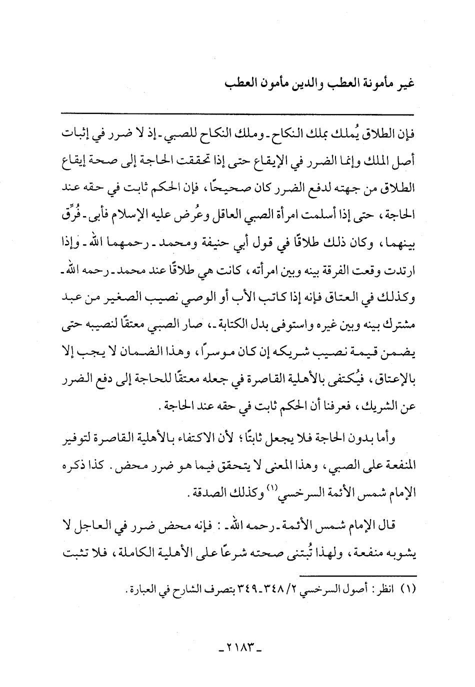 قال الإمام شمس الأئمة- رحمه الله-: فإنه محض ضرر في العاجل لا يشوبه منفعة, ولهذا تبنى صحته شرعًا على الأهلية الكاملة, فلا تثبت