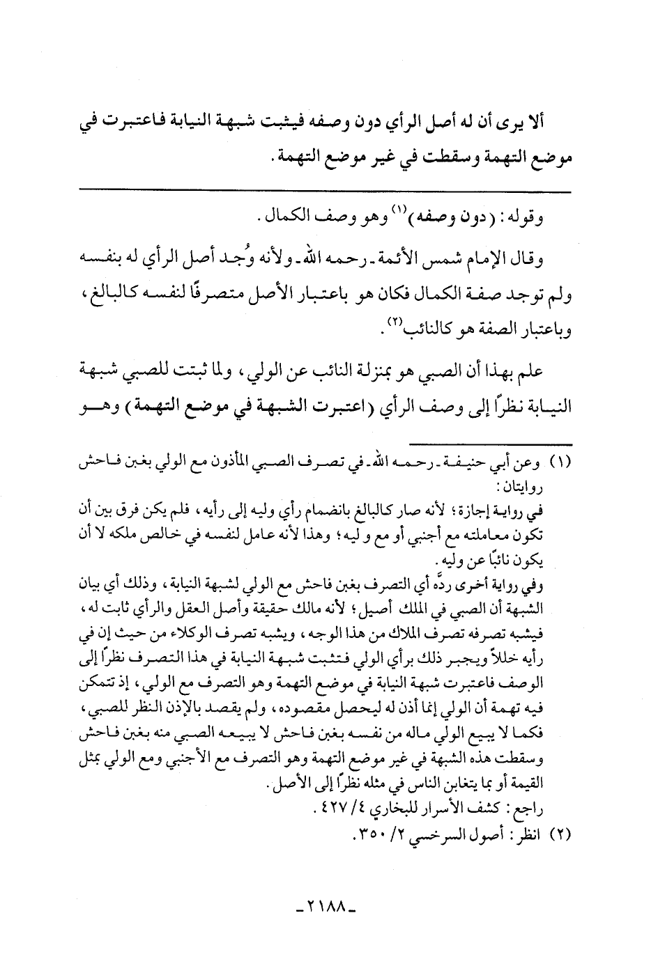 وقال الإمام شمس الأئمة - رحمه الله - ولأنه وجد أصل الرأى له بنفسه ولم توجد صفة الكمال فكان هو باعتبار الأصل متصرفًا لنفسه كالبالغ, وباعتبار الصفة هو كالنائب.