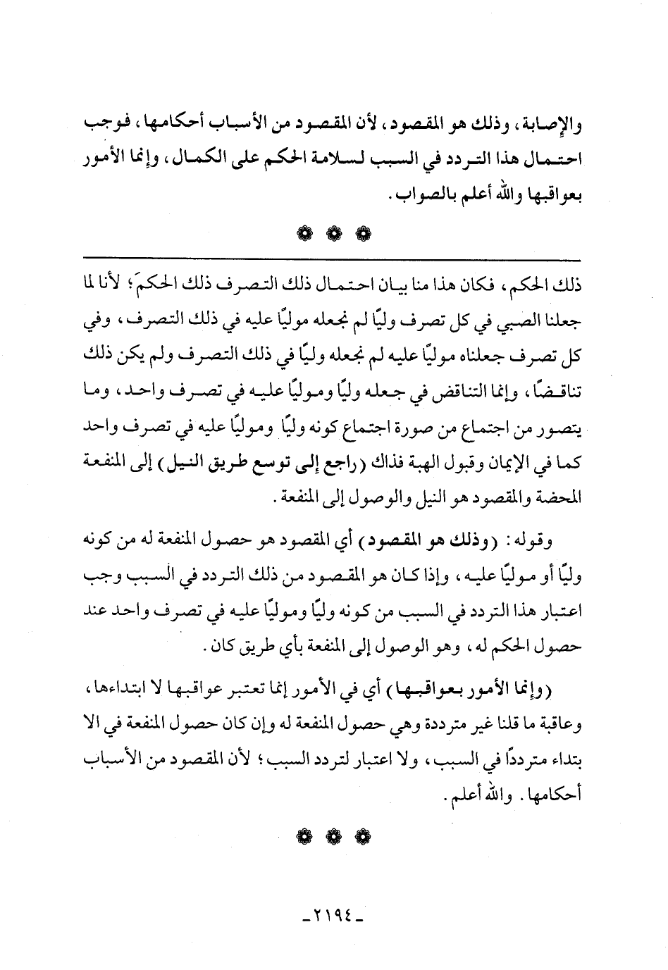 (وإنما الأمور بعواقبها) أي في الأمور إنما تعتبر عواقبها لا ابتدائها, وعاقبة ما قلنا غير مترددة وهى حصول المنفعة له وإن كان حصول المنفعة في الابتداء مترددًا في السبب, ولا اعتبار لتردد السبب؛ لأن المقصود من الأسباب أحكامها. والله أعلم.