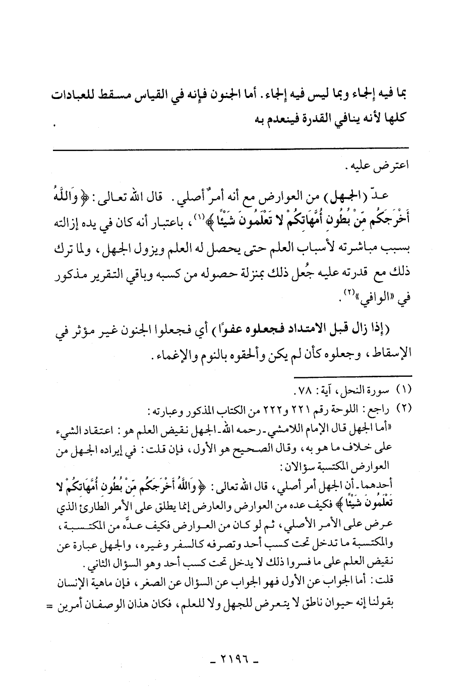 عد (الجهل) من العوارض مع أنه أمر أصلي. قال الله تعالى: (واللَّهُ أَخْرَجَكُم مِّنْ بُطُونِ أُمَّهَاتِكُمْ لا تَعْلَمُونَ شَيْئًا) باعتبار أنه كان في يده إزالته بسبب مباشرته لأسباب العلم حتى يحصل له العلم ويزول الجهل ولما ترك ذلك مع قدرته عليه جعل ذلك بمنزلة حصوله مع كبسه وباقي التقرير مذكور في "الوافي".