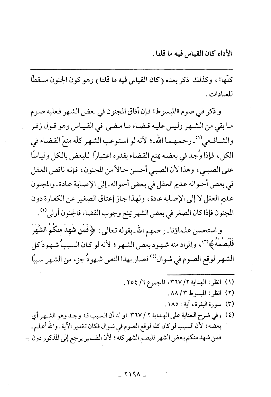 واستحسن علماؤنا -رحمهم الله- بقوله تعالى: (فَمَنْ شَهِدَ مِنْكُمْ الشَّهْرَ فَلْيَصُمْهُ) والمراد منه شهود بعض الشهور لأنه لو كان السبب شهود كل الشهر لوقع الصوم في شوال فصار بهذا النص شهود جزء من الشهر سببًا