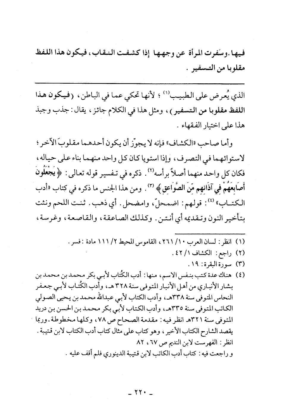 وأما صاحب "الكشاف" فإنه لا يجوز أن يكون أحدهما مقلوب الأخر؛ لاستوائهما في التصرف، وإذا استويا كان كل واحد منهما بناء على حياله، فكان كل واحد منهما أصلًا برأسه. ذكره في تفسير قوله تعالى: {يَجْعَلُونَ أَصَابِعَهُمْ فِي آذَانِهِمْ مِنْ الصَّوَاعِقِ}. ومن هذا الجنس ما ذكره في كتاب "أدب الكتاب": قولهم: اضمحل، وامضحل. أي ذهب. ثنت اللحم ونثت بتأخير النون وتقديمه أي أنتن. وكذلك الصاعقة، والقاصعة، وغرسه،