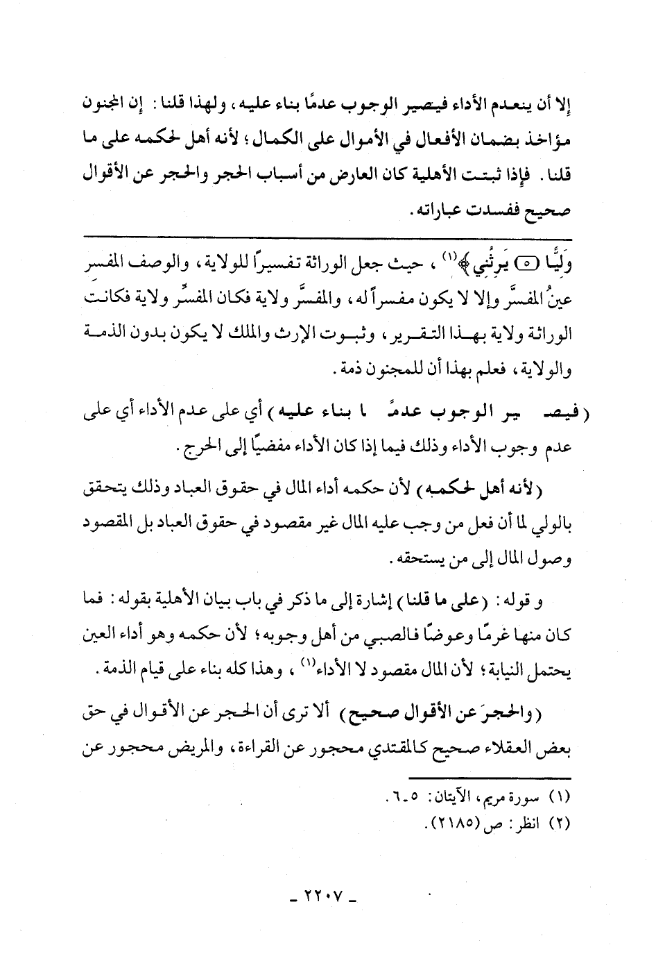 ولِيًا (5) يَرِثُنِي)، حيث جعل الوراثة تفسيرًا للولاية، والوصف المفسر عين المفسّر وإلا لا يكون مفسرًا له، والمفسر ولاية فكان المفسر ولاية فكانت الوراثة ولاية بهذا التقرير، وثبوت الإرث والملك لا يكون بدون الذمة والولاية، فعلم بهذا أن للمجنون ذمة.
