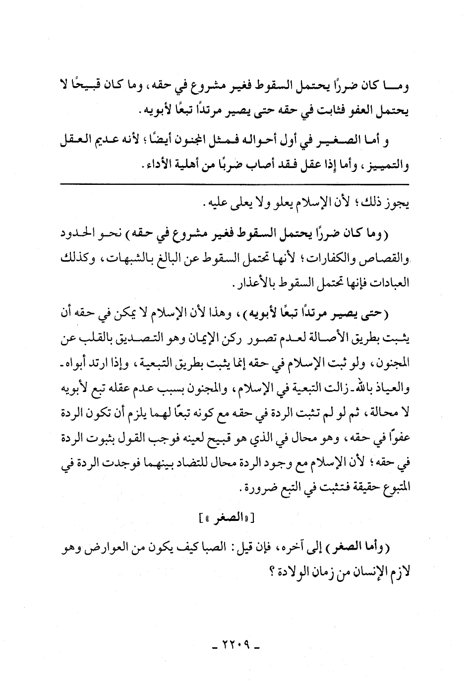 (حتى يصير مرتدًا تبعًا لأبويه)، وهذا لأن الإسلام لا يمكن في حقه أن يثبت بطريق الأصالة لعدم تصور ركن الإيمان وهو التصديق بالقلب عن المجنون، ولو ثبت الإسلام في حقه إنما يثبت بطريق التبعية، وإذا ارتد أبواه -والعياذ بالله- زالت التبعية في الإسلام، والمجنون بسبب عدم عقله تبع لأبويه لا محالة، ثم لو لم تثبت الردة في حقه مع كونه تبعًا لهما يلزم أن تكون الردة عفوًا في حقه، وهو محال في الذي هو قبيح لعينه فوجب القول بثبوت الردة في حقه؛ لأن الإسلام مع وجود الردة محال للتضاد بينهما فوجدت الردة في المتبوع حقيقة فتثبت في التبع ضرورة.