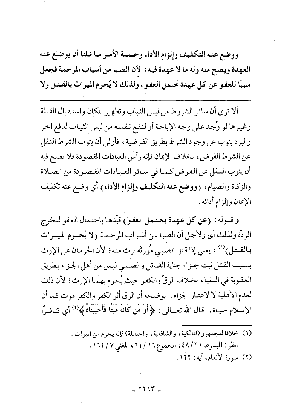 وقوله: (عن كل عهدة يحتمل العفو) قيّدها باحتمال العفو لتخرج الردة ولذلك أي ولأجل أن الصبا من أسباب المرحمة (لا يُحرم الميراث بالقتل)، يعني إذا قتل الصبي مورثه يرث منه؛ لأن الحرمان عن الإرث بسبب القتل ثبت جزاء جناية القاتل والصبي ليس من أهل الجزاء بطريق العقوبة في الدنيا، بخلاف الرق والكفر حيث يحرم بهما الإرث؛ لأن ذلك لعدم الأهلية لا لاعتبار الجزاء. يوضحه أن الرق أثر الكفر والكفر موت كما أن الإسلام حياة. قال الله تعالى: (أَوَ مَن كَانَ مَيْتًا فَأَحْيَيْنَاهُ) أي كافرًا