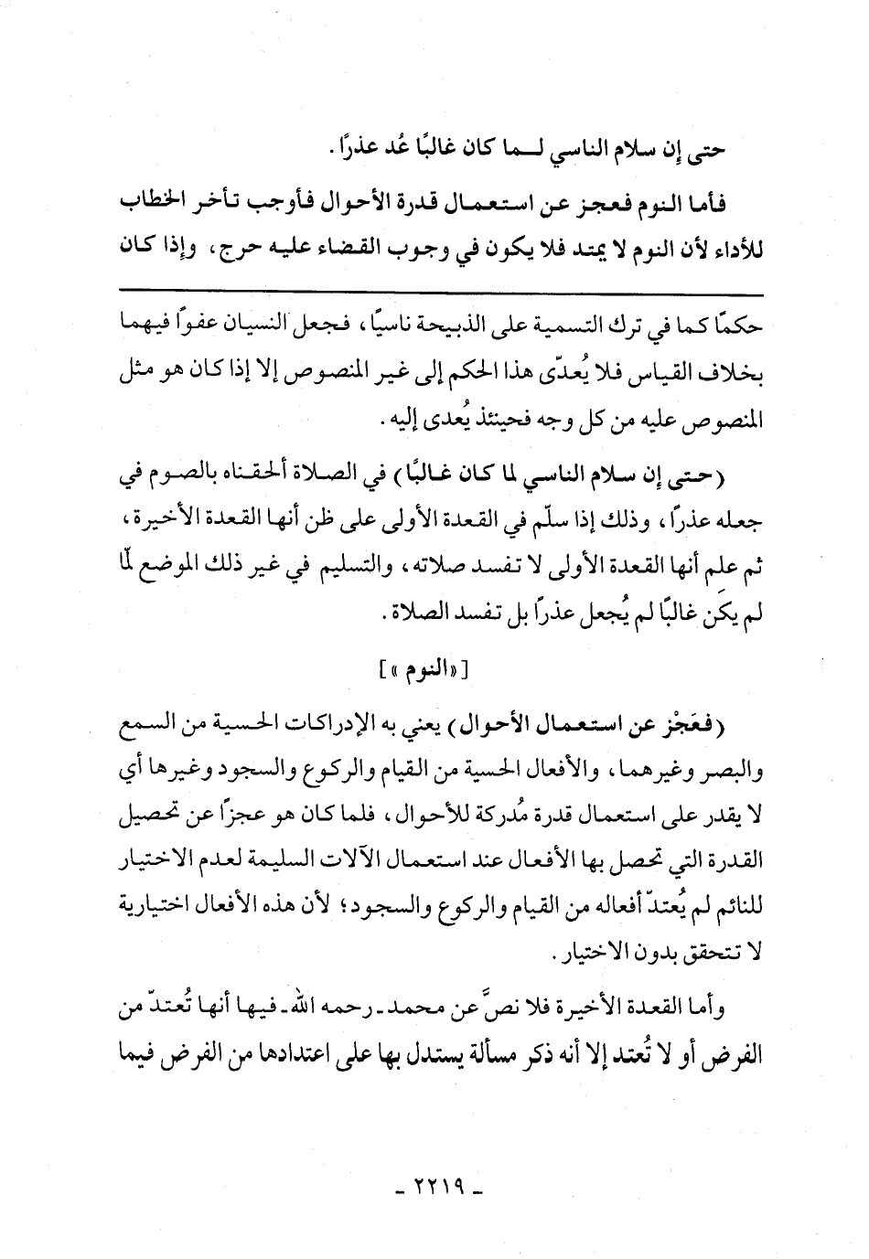 (فعجز عن استعمال الأحوال) يعني به الإدراكات الحسية من السمع والبصر وغيرهما، والأفعال الحسية من القيام والركوع والسجود وغيرها أي لا يقدر على استعمال قدرة مدركة للأحوال، فلما كان هو عجزًا عن تحصيل القدرة التي تحصل بها الأفعال عند استعمال الآلات السليمة لعدم الاختيار للنائم لم يُعتد أفعاله من القيام والركوع والسجود؛ لأن هذه الأفعال اختيارية لا تتحقق بدون الاختيار.