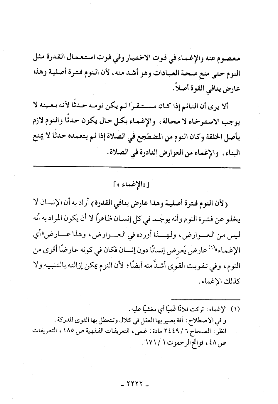 (لأن النوم فترة أصلية وهذا عارض ينافي القدرة) أراد به أن الإنسان لا يخلو عن فترة النوم وأنه يوجد في كل إنسان ظاهرًا لا أن يكون المراد به أنه ليس من العوارض, ولهذا أورده في العوارض, وهذا عارض ((أي الإغماء)) عارض يعرض إنسانًا دون إنسان فكان في كونه عارضًا أقوى من النوم, وفي تفويت القوى أشد منه أيضًا, لأن النوم يمكن إزالته بالتنبيه ولا كذلك الإغماء.