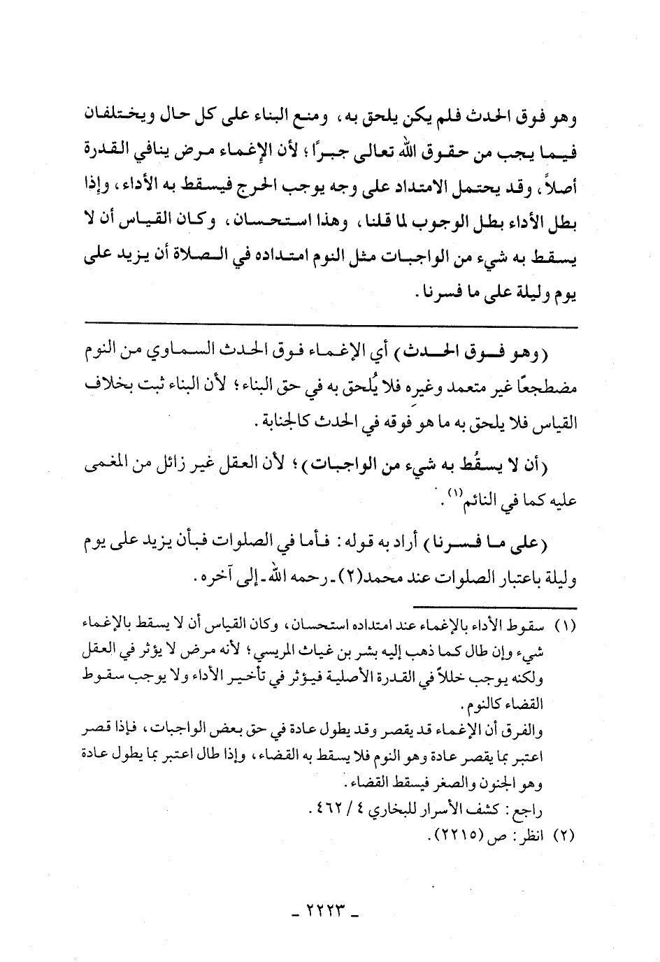 ((وهو فوق الحدث)) أى الإغماء فوق الحدث السماوي من النوم مضطجعًا غير معتمد وغيره فلا يلحق به في حق البناء, لأن البناء ثبت بخلاف القياس فلا يلحق به ماهو فوقه في الحدث كالجنابة.