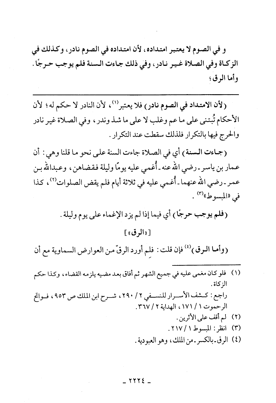 (لأن الامتداد في الصوم نادر) فلا يعتبر, لأن النادر لا حكم له, لأن الأحكام تبتنى على ما عم وغلب لا على ما شذ وندر, وفي الصلاة غير نادر والحرج فيها بالتكرار فلذلك سقطت عند التكرار.