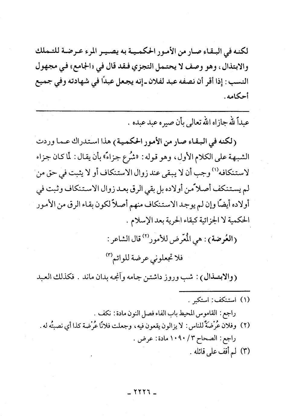 (لكنه في البقاء صار من الأمور الحكيمة) هذا إستدراك عما وردت الشبهة على الكلام الأول, وهو قوله: ((شرع جزاء)) بأن يقال: لما كان جزاء لاستنكافه وجب أن لا يبقى عند زوال الإستكناف أو لا يثبت في أولاده أيضًا وإن لم يوجد الإستنكاف منهم أصلًا لكون بقاء الرق من الأمور الحكمية لا الجزائية كبقاء الحرية بعد الإسلام.