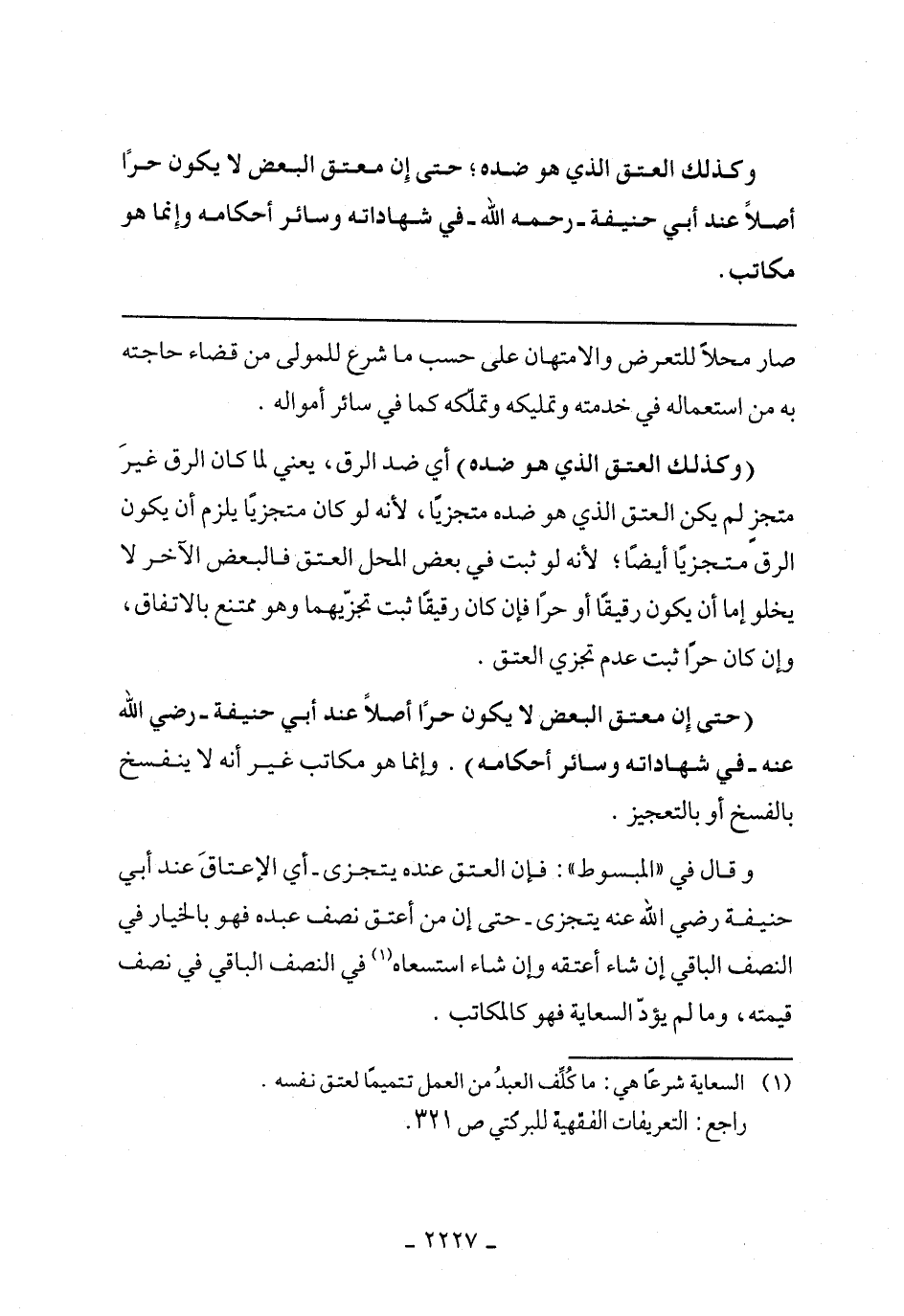 (حتى إن معتق البعض لا يكون حرًا أصلًا عند أبى حنيفة -رضي الله عنه-في شهاداته وسائر أحكامه). وإنما هو مكاتب غير أنه لا ينفصخ بالفسخ أو بالتعجيز.
