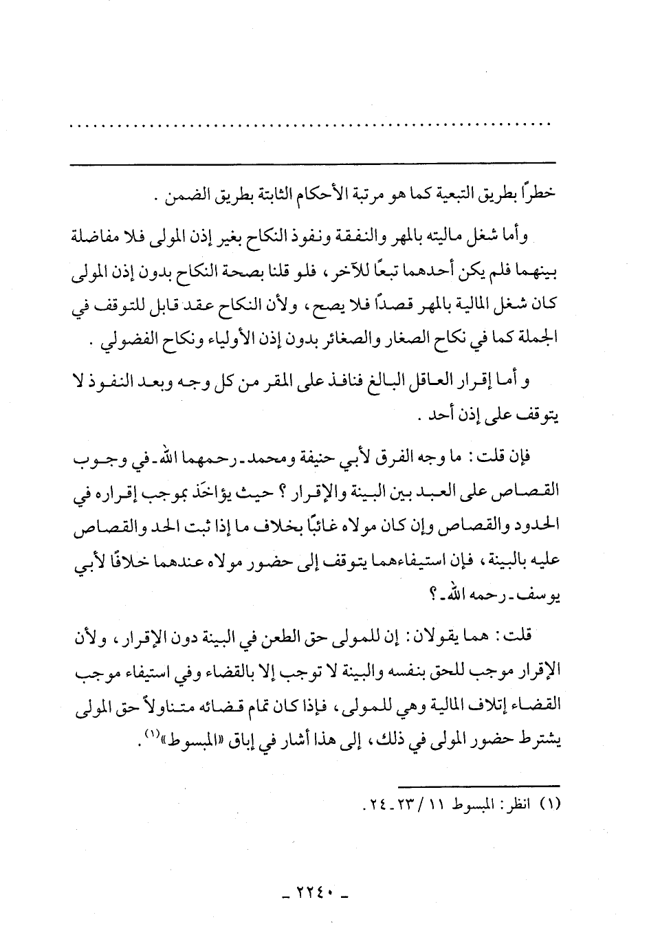 قلت: هما يقولان: إن للمولى حق الطعن في البينة دون الإقرار, ولأن الإقرار موجب للحق بنفسه والبينة لا توجب إلا بالقضاء وفي استيفاء موجب القضاء إتلاف المالية وهى للمولى, فإذا كان تمام قضائه متناولًا حق المولى يشترط حضور المولى في ذلك, إلى هذا أشار في إباق ((المبسوط)).