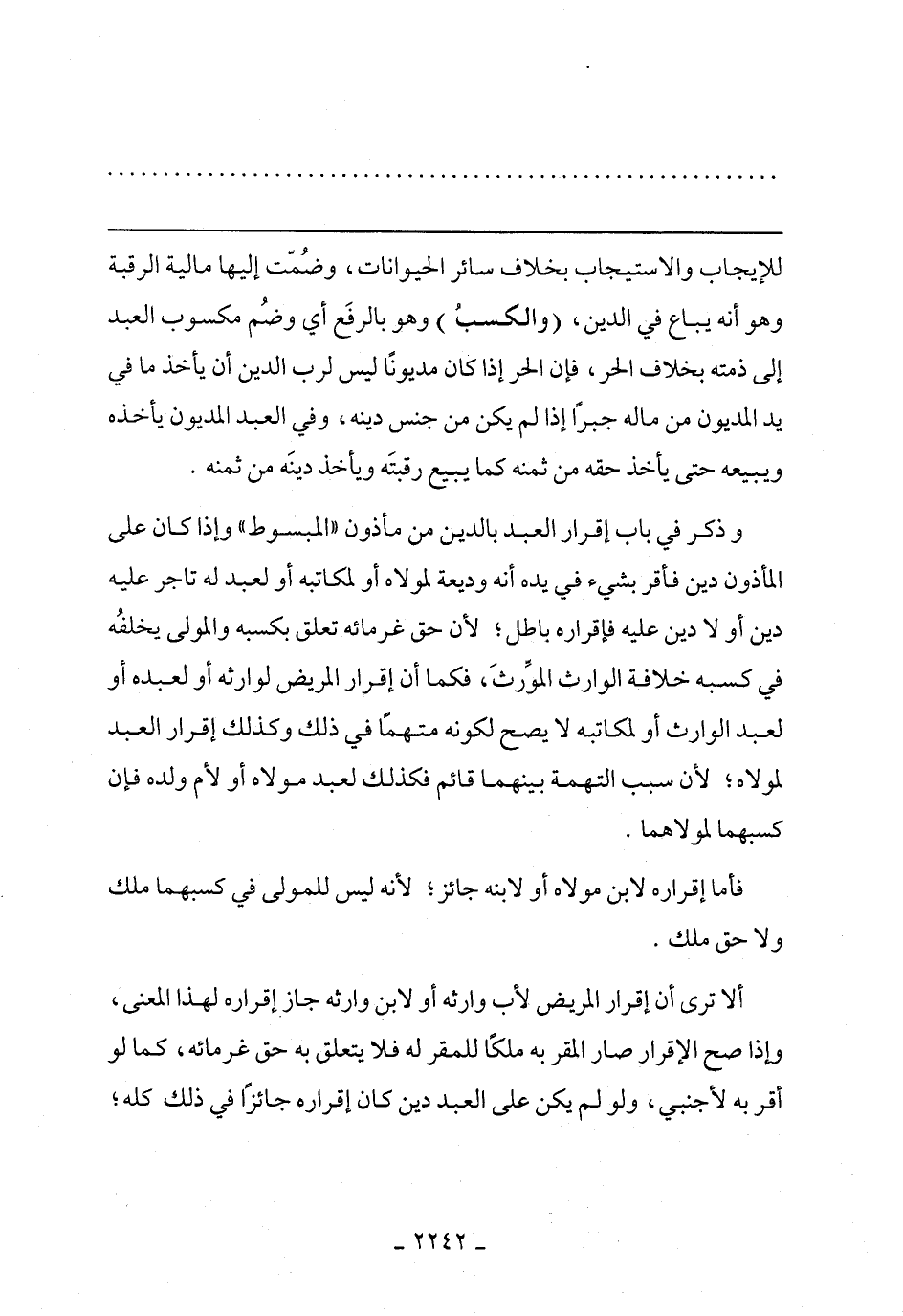 للإيجاب والاستجاب بخلاف سائر الحيوانات, وضمنت إليها مالية الرقبة وهو أنه يباع في الدين, (والكسب) وهو بالرفع أي وضم مكسوب العبد إلى ذمته بخلاف الحر, فأن الحر إذا كان مديونًا ليس لرب الدين الدين أن يأخذ ما في يد المديون من ماله جبرًا إذا لم يكن من جنس دينه, وفي العبد المديون يأخذه ويبيعه حتى يأخذ حقه من ثمنه كما يبيع رقبته ويأخذ دينه من ثمنه.