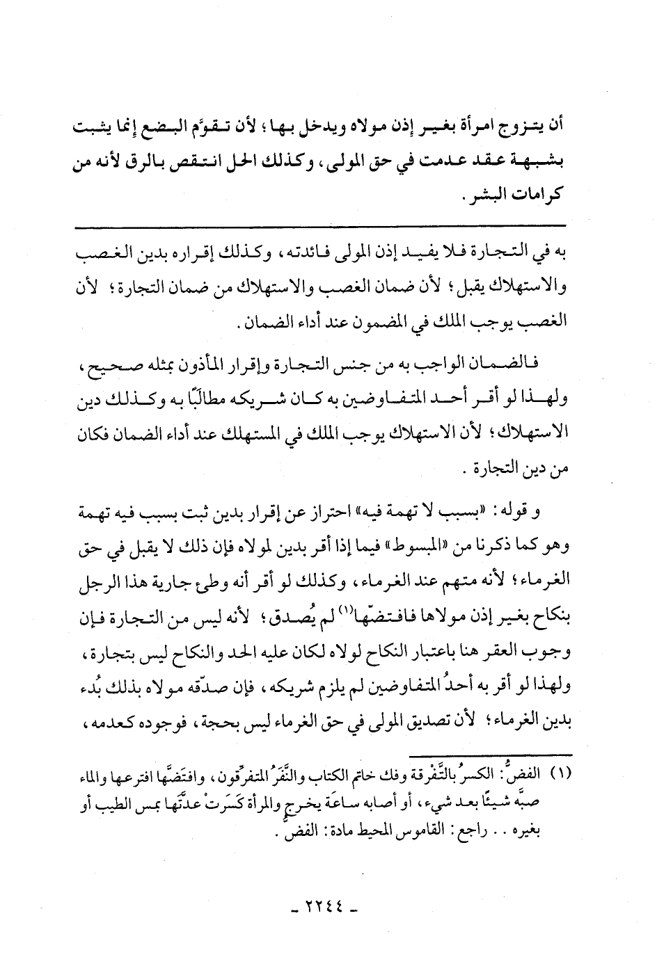 فالضمان الواجب به من جنس التجارة وإقرار المأذون بمثله صحيح, ولهذا لو أقر أحد المتفاوضين به كان شريكه مطالبًا به وكذلك دين الاستهلاك, لأن الاستهلاك يوجب الملك في المستهلك عند أداء الضمان فكان من دين التجارة.