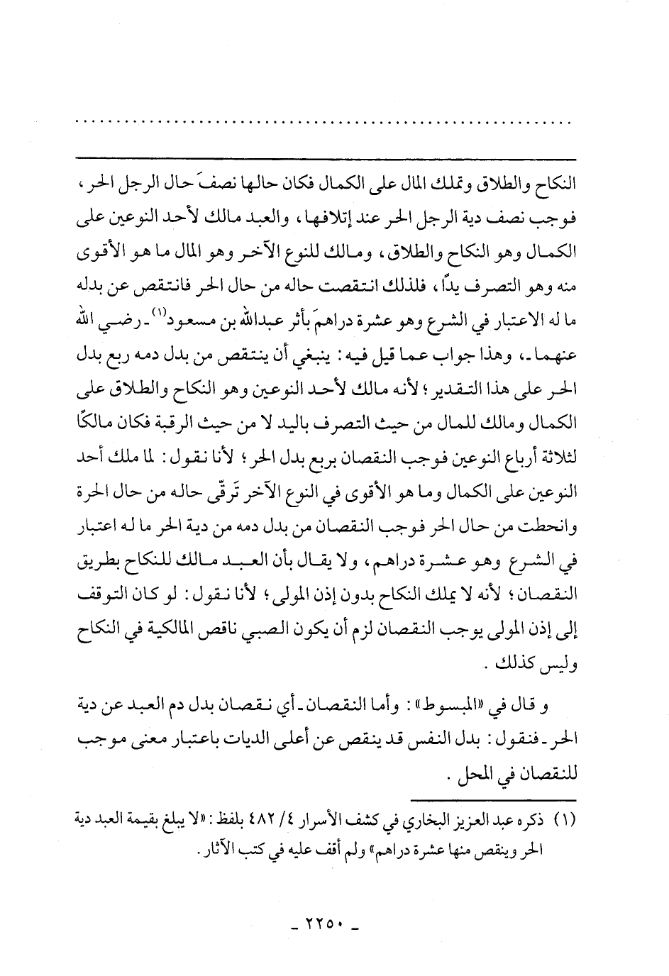 النكاح والطلاق وتمالك المال على الكمال فكان حالها نصف حال الرجل الحر, فوجب نصف دية الرجب الحر عند إتلافها, والعبد مالك لأحد النوعين على الكمال وهو النكاح والطلاق, ومالك للنوع الآخر وهو المال ماهو الاقوى منه وهو التصرف يدًا, فلذلك انتقصت حاله من حال الحر فانتقص عن بدله ماله الاعتبار في الشرع وهو عشرة دراهم بأثر عبدالله بن مسعود -رضي الله عنهما-وهذا جواب عما قيل فيه: ينبغي أن يتنقص من بدل دمه ربع بدل الحر على هذا التقدير, لانه مالك لأحد النوعين وهو النكاح والطلاق على الكمال ومالك للمال من حيث التصرف باليد لا من حيث الرقبة فكان مالكًا لثلاثة أرباع النوعين فوجب النقصان بربع بدل الحر, لأنا نقول: لما ملك أحد النوعيم على الكمال وما هو الأقوى في النوع الآخر ترقى حاله من حال الحرة وانحطت من حال الحر فوجب النقصان من بدل دمه من دية الرح ماله اعتبار في الشرع وهو عشرة دراهم, ولا يقال بأن العبد مالك لنكاح بطريق النقصان, لأنه لا يملك النكاح بدون إذن المولى, لأنا نقول: لو كان التوقف إلى إذن المولى يوجب النقصان لزم أن يكون الصبي ناقص المالكية في النكاح وليس كذلك.