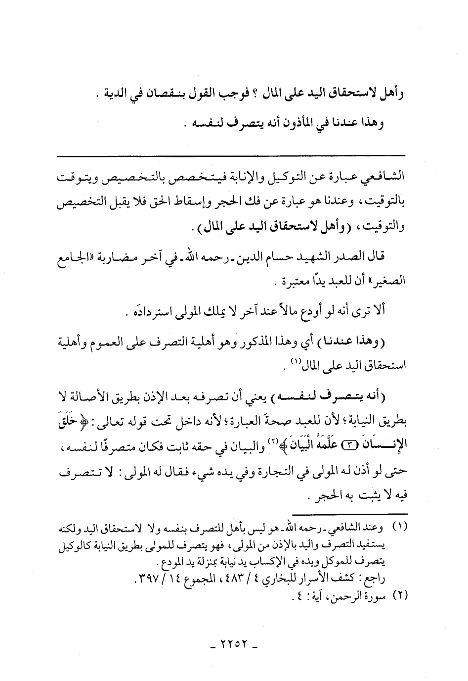 (أنه يتصرف لنفسه) يعنى أن تصرفه بعد الإذن بطريق الأصالة لا بطريق النيابة؛ لأن للعبد صحةَ العبارة، لأنه داخل تحت قوله تعالى: (خَلَقَ الْإِنْسَانَ (3) عَلَّمَهُ الْبَيَان) والبيان في حقه ثابت فكان متصرفًا لنفسه، حتى لو أذن له المولى في التجارة وفي يده شيء فقال له المولى: لا تتصرف فيه لا يثبت به الحجر.