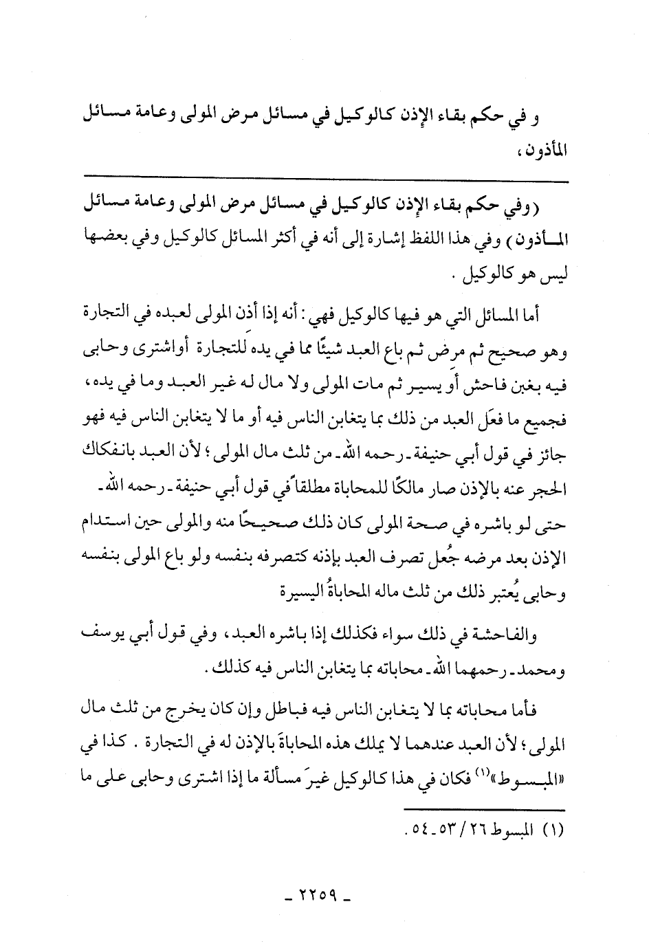 أما المسائل التي هو فيها كالوكيل فهي: أنه إذا أذِن المولى لعبده في التجارة وهو صحيح ثم مرض ثم باع العبد شيئًا مما في يده أو غشترى وحابى فيه بغبن فاحش أو يسير ثم مات المولى ولا مال له غير العبد وما في يده، فجميع ما فعَل العبد من ذلك بما يتغابن الناس فيه أو ما لا يتغابن الناس فيه فهو جائز في قول أبي حنيفة-رحمه الله- من ثلث مال المولى؛ لأن العبد بإنفكاك الحجر عنه بالإذن صار مالكًا للمحاباة مطلقًا في قول أبي حنيفة-رحمه الله-حتى لو باشره في صحة المولى كان ذلك صحيحًا منه والمولى حين إستدام الإذن بعد مرضه جُعل تصرف العبد بإذنه كتصرفه بنفسه ولو باع المولى بنفسه وحابى يُعتبر ذلك من ثلث ماله المحاباةُ اليسيرة.