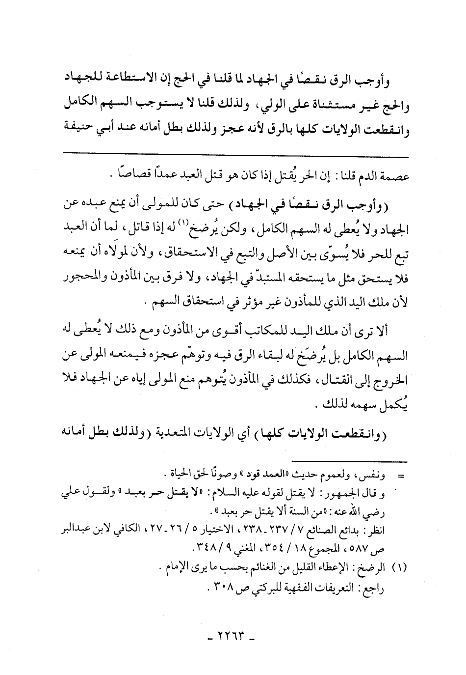 (وأوجب الرق نقصًا في الجهاد) حتى لو كان للمولى أن يمنع عبده عن الجهاد ولا يعطى له السهم الكامل، ولكن يرضخ له إذا قاتل، لما أن العبد تبع للحر فلا يسوى بين الأصل والتبع في الاستحقاق، ولأن لمولاه أن يمنعه فلا يستح مثل ما يستحقه المستبد في الجهاد، ولا فرق بين المأذون والمحجور لأن ملك اليد الذي للمأذون غير مؤثر في استحقاق السهم.