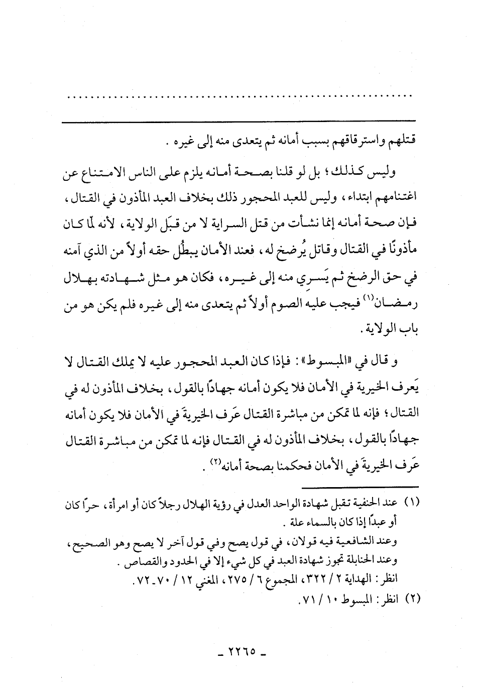 وليس كذلك، بل لو قلنا بصحة أمانة يلزم على الناس الامتناع عن اغتنامهم ابتداء، وليس للعبد المحجور ذلك بخلاف العبد المأذون في القتال، فإن صحة أمانة إنما نشأت من قتل السراية لا من قبل الولاية، لأنه لما كان مأذونًا في القتال وقاتل يرضخ له، فعند الأمان يبطل حقه أولًا من الذي آمنة في حق الرضخ ثم يسري منه إلى غيره، فكان هو مثل شهادته بهلال رمضان فيجب عليه الصوم أولًا ثم يتعدى منه إلى غيره فلم يكن هو من باب الولاية.
